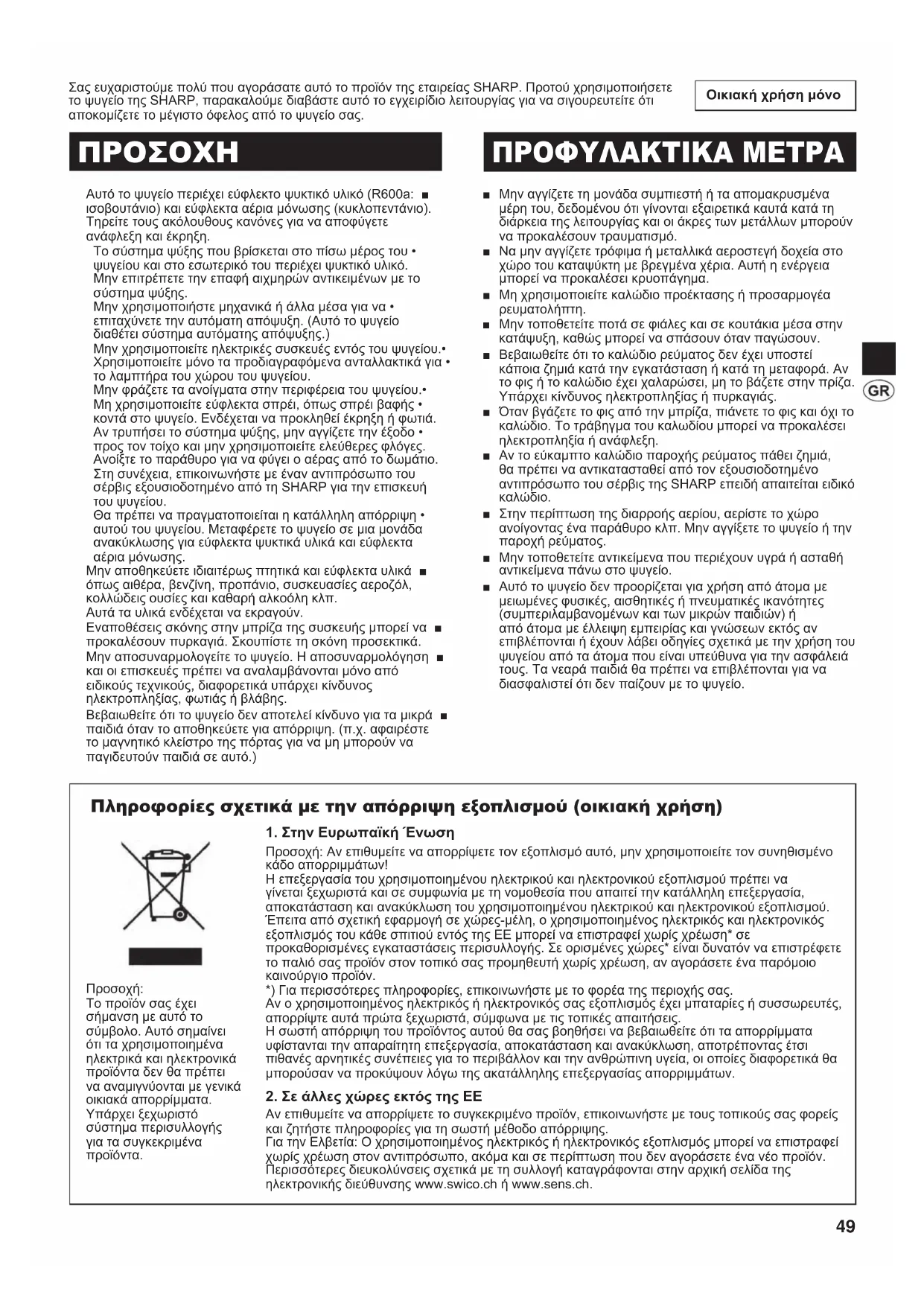 Στην περίπτωση της διαρροής αερίου, αερίστε το χώρο ■ ανοίγοντας ένα παράθυρο κλπ. Μην αγγίξετε το ψυγείο ή την παροχή ρεύματος. Μην τοποθετείτε αντικείμενα που περιέχουν υγρά ή ασταθή ■ αντικείμενα πάνω στο ψυγείο. Αυτό το ψυγείο δεν προορίζεται για χρήση από άτομα με ■ μειωμένες φυσικές, αισθητικές ή πνευματικές ικανότητες (συμπεριλαμβανομένων και των μικρών παιδιών) ή από άτομα με έλλειψη εμπειρίας και γνώσεων εκτός αν επιβλέπονται ή έχουν λάβει οδηγίες σχετικά με την χρήση του ψυγείου από τα άτομα που είναι υπεύθυνα για την ασφάλειά τους. Τα νεαρά παιδιά θα πρέπει να επιβλέπονται για να διασφαλιστεί ότι δεν παίζουν με το ψυγείο. Πληροφορίες σχετικά με την απόρριψη εξοπλισμού (οικιακή χρήση)