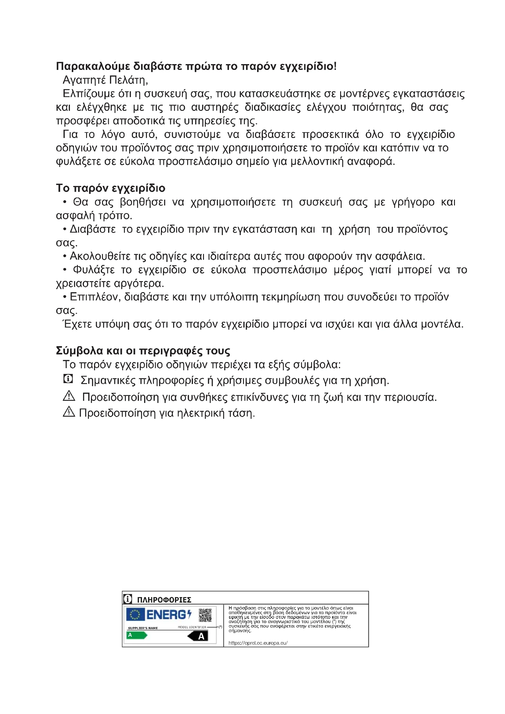 - Φυλάξτε το εγχειρίδιο σε εύκολα προσπελάσιμο μέρος γιατί μπορεί να το χρειαστείτε αργότερα.