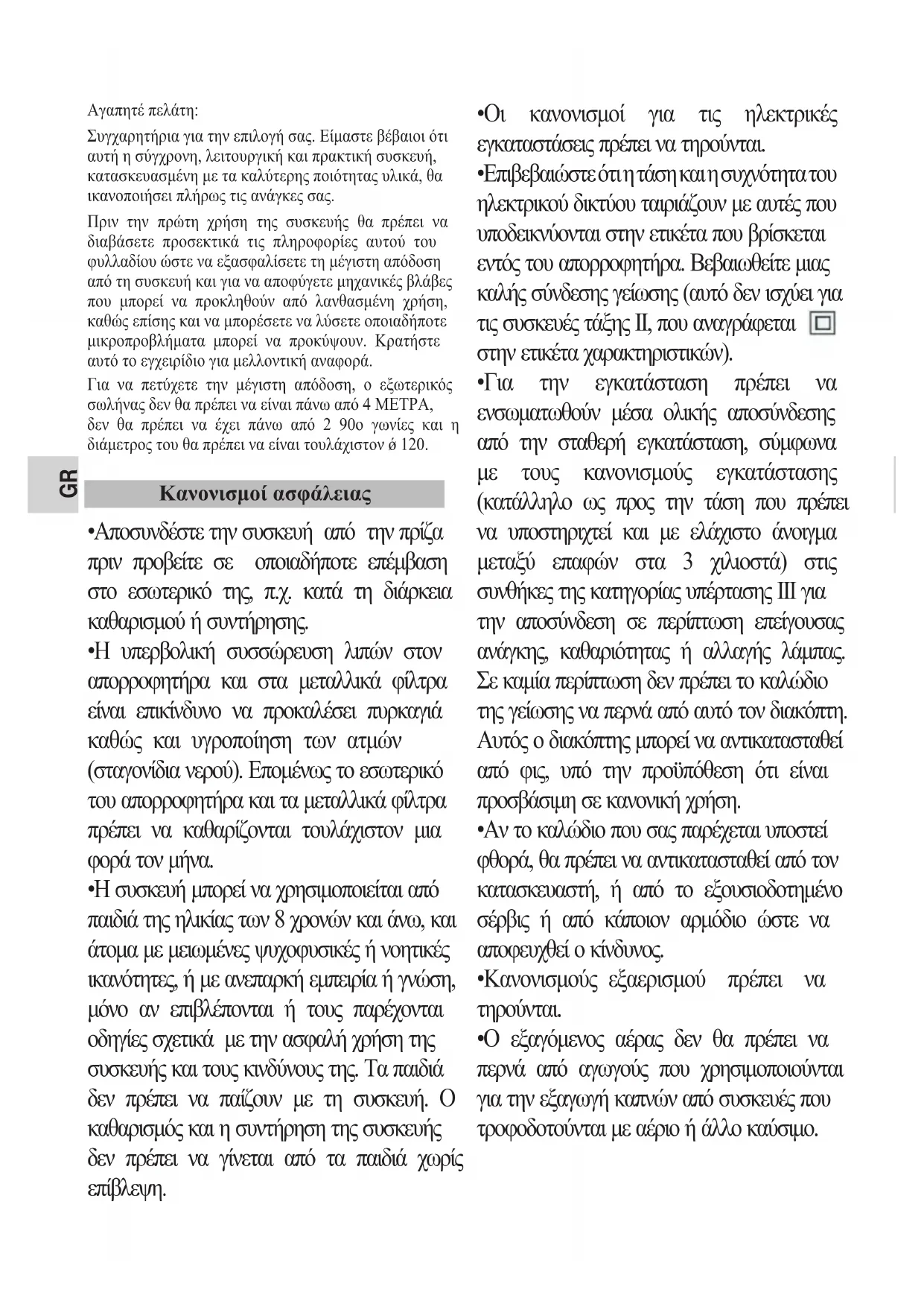 - Ο εξαγόμενος αέρας δεν θα πρέπει να περνά από αγωγούς που χρησιμοποιούνται για την εξαγωγή καπνών από συσκευές που τροφοδοτούνται με αέριο ή άλλο καύσιμο. Κανονισμοί ασφάλειαςGR