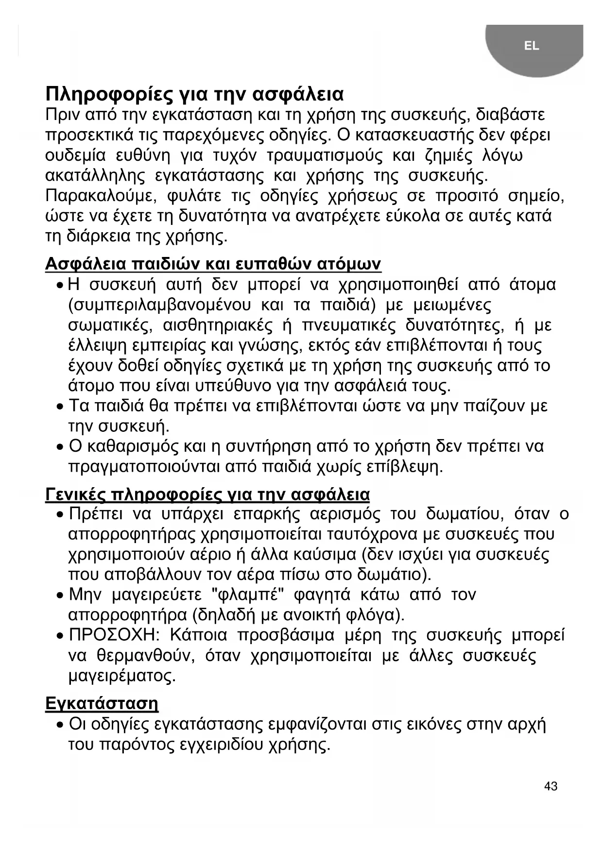 Πληροφορίες για την ασφάλεια Πριν από την εγκατάσταση και τη χρήση της συσκευής, διαβάστε προσεκτικά τις παρεχόμενες οδηγίες. Ο κατασκευαστής δεν φέρει ουδεμία ευθύνη για τυχόν τραυματισμούς και ζημιές λόγω ακατάλληλης εγκατάστασης και χρήσης της συσκευής. Παρακαλούμε, φυλάτε τις οδηγίες χρήσεως σε προσιτό σημείο, ώστε να έχετε τη δυνατότητα να ανατρέχετε εύκολα σε αυτές κατά τη διάρκεια της χρήσης. Ασφάλεια παιδιών και ευπαθών ατόμων