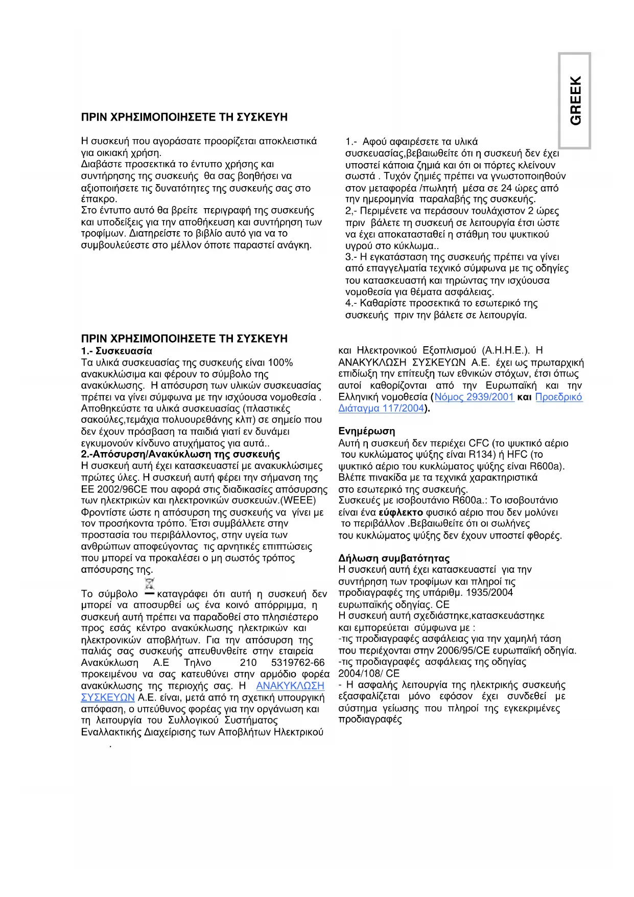 Αυτή η συσκευή δεν περιέχει CFC (το ψυκτικό αέριο του κυκλώματος ψύξης είναι R134) ή HFC (το ψυκτικό αέριο του κυκλώματος ψύξης είναι R600a). Βλέπε πινακίδα με τα τεχνικά χαρακτηριστικά στο εσωτερικό της συσκευής. Συσκευές με ισοβουτάνιο R600a.: Το ισοβουτάνιο είναι ένα εύφλεκτο φυσικό αέριο που δεν μολύνει το περιβάλλον .Βεβαιωθείτε ότι οι σωλήνες του κυκλώματος ψύξης δεν έχουν υποστεί φθορές. Δήλωση συμβατότητας Η συσκευή αυτή έχει κατασκευαστεί για την συντήρηση των τροφίμων και πληροί τις προδιαγραφές της υπάριθμ. 1935/2004 ευρωπαϊκής οδηγίας. CE Η συσκευή αυτή σχεδιάστηκε,κατασκευάστηκε και εμπορεύεται σύμφωνα με : -τις προδιαγραφές ασφάλειας για την χαμηλή τάση που περιέχονται στην 2006/95/CE ευρωπαϊκή οδηγία. -τις προδιαγραφές ασφάλειας της οδηγίας 2004/108/ CE - Η ασφαλής λειτουργία της ηλεκτρικής συσκευής εξασφαλίζεται μόνο εφόσον έχει συνδεθεί με σύστημα γείωσης που πληροί της εγκεκριμένες προδιαγραφές