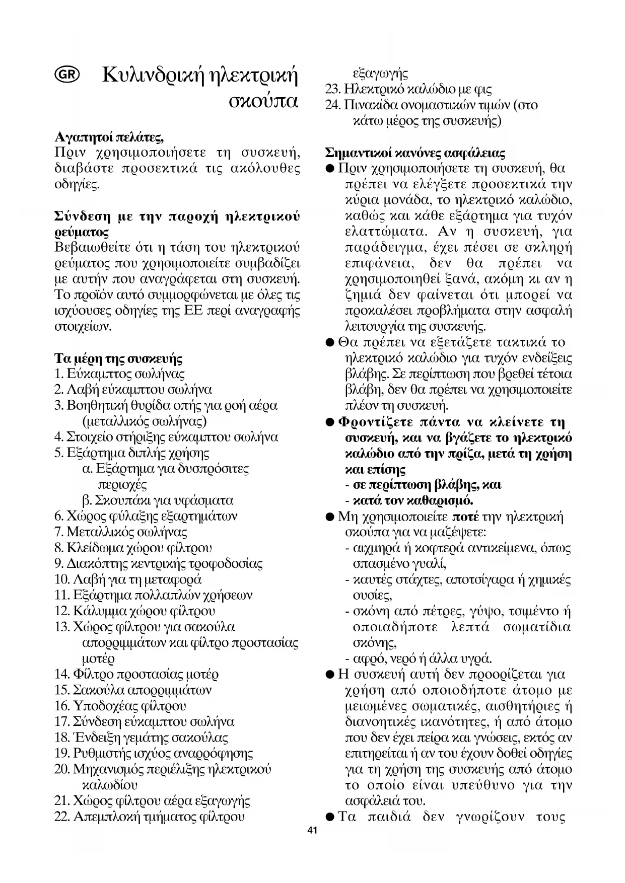 Αφαιρ'στε τυχν υλικ της εξωτερικς και εσωτερικς συσκευασας και βεβαιωθετε τι η σακολα, το φλτρο προστασας μοτ'ρ, και τα φλτρα α'ρα εξαγωγς εναι σωστ τοποθετημ'να. Διακπτης ασφλειας Αυτ η ηλεκτρικ σκοπα εναι εξοπλισμ'νη με ενσωματωμ'νο μηχανισμ διακοπς, ο οποος απενεργοποιε αυτματα τη συσκευ σε περπτωση υπερθ'ρμανσης (π.χ. λγω εμποδου στο σωλνα στο φλτρο). Σε περπτωση που ενεργοποιηθε αυτς ο μηχανισμς, βγλτε το ηλεκτρικ καλ$διο απ την πρζα και αφστε τη συσκευ να κρυ$σει για μα τουλχιστον $ρα. Μπορετε να χρησιμοποισετε ξαν την ηλεκτρικ σκοπα αφο πρ$τα αφαιρ'σετε το