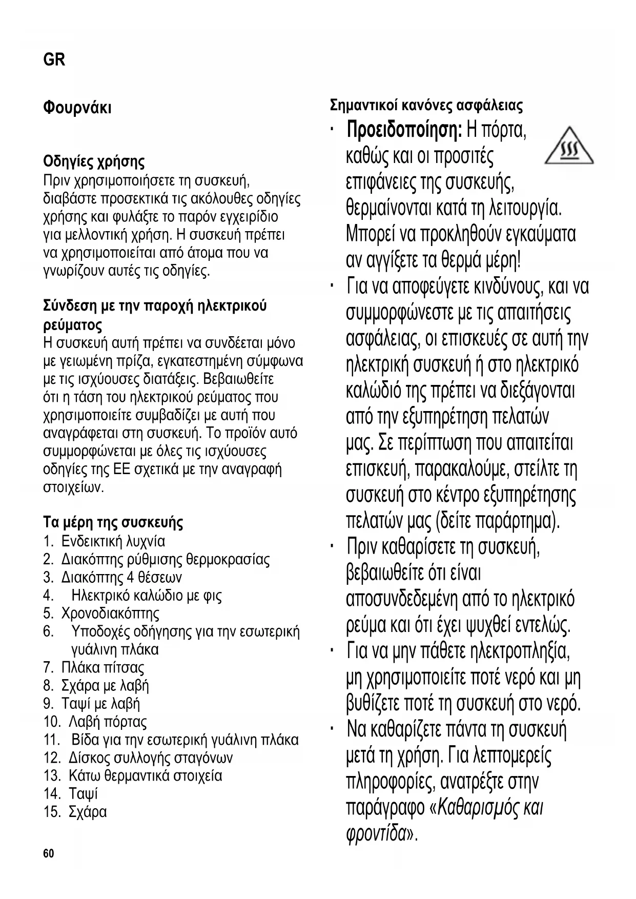 GR61 ∙ Η συσκευή δεν προορίζεται για λειτουργία με εξωτερικό χρονοδιακόπτη ή ξεχωριστό τηλεχειριζόμενο σύστημα. ∙ Η συσκευή αυτή μπορεί να χρησιμοποιηθεί από παιδιά (τουλάχιστον 8 ετών) και από άτομα με μειωμένες φυσικές, αισθητήριες ή διανοητικές ικανότητες ή χωρίς πείρα και γνώσεις, με την προϋπόθεση ότι επιτηρούνται ή τους έχουν δοθεί οδηγίες σχετικά με τη χρήση της συσκευής και κατανοούν πλήρως όλους τους εμπλεκόμενους κίνδυνους και προφυλάξεις για την