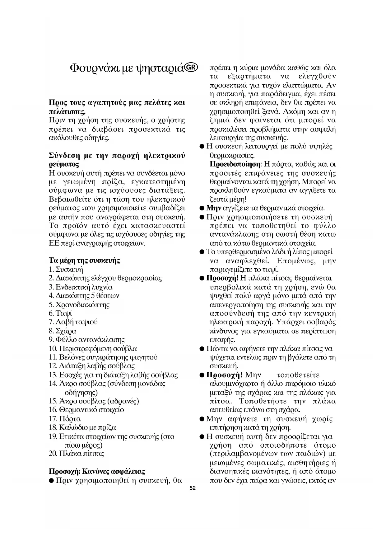 ● Προσοχ! Μην τοποθετετε αλουμινχαρτο λλο παρμοιο υλικ μεταξ" της σχρας και της πλκας για πτσα. Τοποθετστε την πλκα απευθεας επνω στη σχρα. ● Μην αφνετε τη συσκευ χωρς επιτρηση κατ τη χρση. ● Η συσκευ αυτ δεν προορζεται για χρση απ οποιοδποτε τομο (περιλαμβανομνων των παιδι>ν) με μειωμνες σωματικς, αισθητριες διανοητικς ικαντητες, απ τομο που δεν χει περα και γν>σεις, εκτς αν