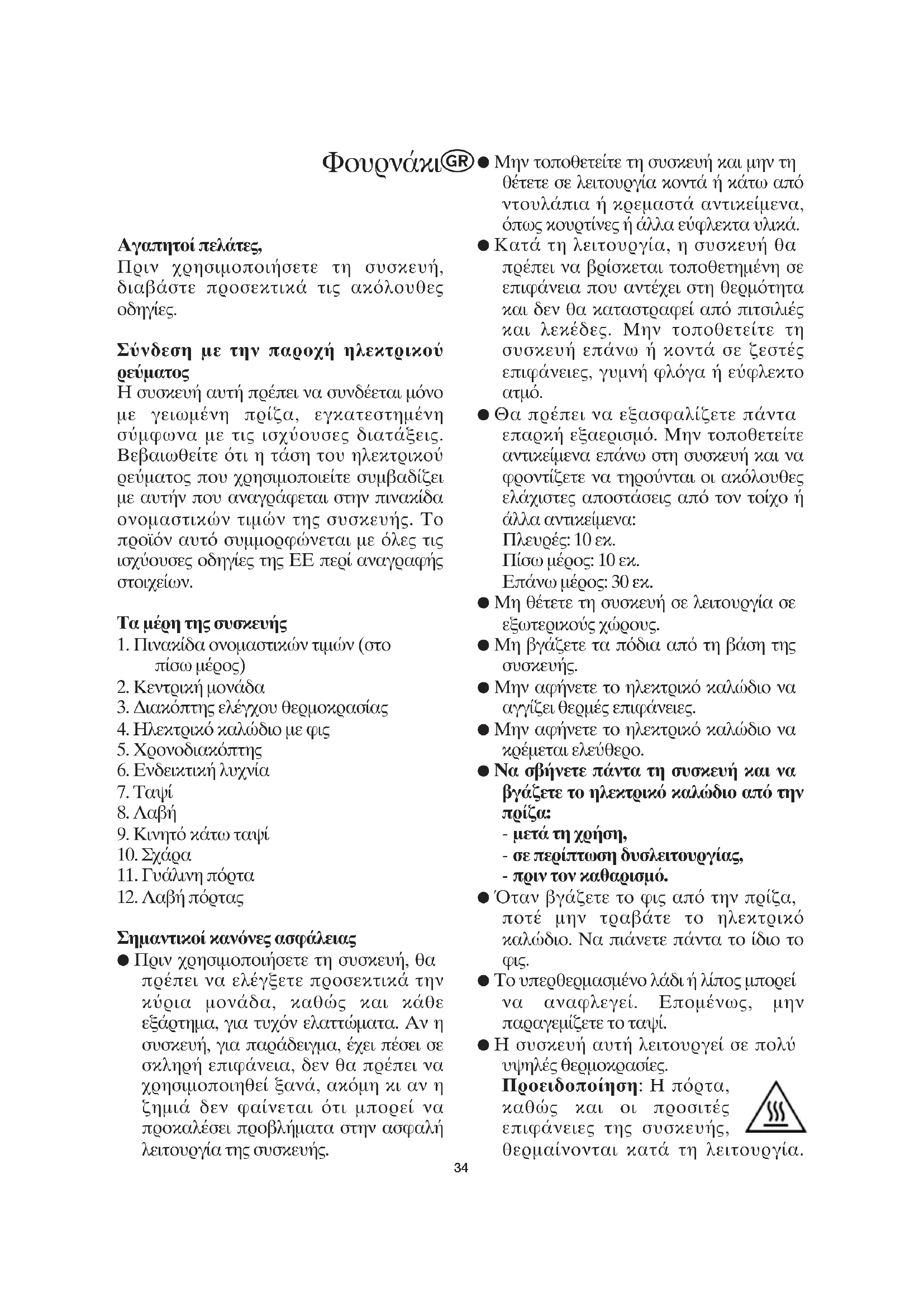 ΦουρνκιΜπορε να προκληθο!ν εγκα!ματα αν αγγξετε αυτ τα θερμ μρη. ● Μην αγγζετε τα θερμαντικ στοιχεα. ● Μην αφνετε τη συσκευ αφ!λακτη, εν% τη χρησιμοποιετε. ● Η συσκευ δεν προορζεται για λειτουργα με εξωτερικ χρονοδιακπτη ξεχωριστ τηλεχειριζμενο σ!στημα. ● Η συσκευ αυτ δεν προορζεται για χρση απ οποιοδποτε τομο (περιλαμβανομνων των παιδι%ν) με μειωμνες σωματικς, αισθητριες διανοητικς ικαντητες, απ τομο που δεν χει περα και γν%σεις, εκτς αν επιτηρεται αν του χουν δοθε οδηγες για τη χρση της συσκευς απ τομο το οποο εναι υπε!θυνο για την ασφλει του. ● Τα παιδι θα πρπει να επιτηρο!νται για να εξασφαλιστε τι δεν παζουν με