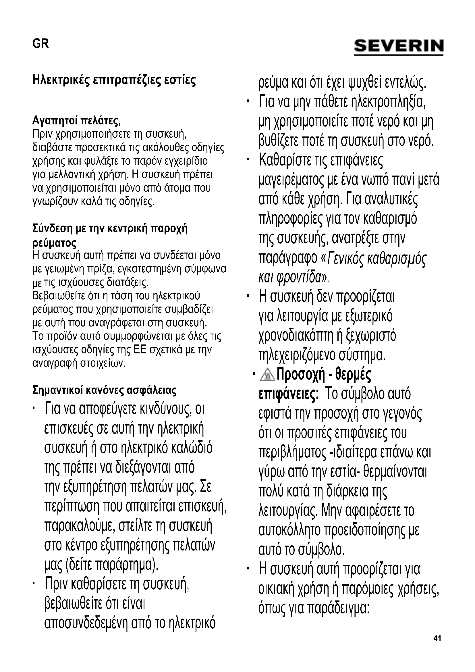 τις ισχύουσες διατάξεις. Βεβαιωθείτε ότι η τάση του ηλεκτρικού ρεύματος που χρησιμοποιείτε συμβαδίζει με αυτή που αναγράφεται στη συσκευή. Το προϊόν αυτό συμμορφώνεται με όλες τις ισχύουσες οδηγίες της ΕΕ σχετικά με την αναγραφή στοιχείων. Σημαντικοί κανόνες ασφάλειας ∙ Για να αποφεύγετε κινδύνους, οι επισκευές σε αυτή την ηλεκτρική συσκευή ή στο ηλεκτρικό καλώδιό της πρέπει να διεξάγονται από την εξυπηρέτηση πελατών μας. Σε περίπτωση που απαιτείται επισκευή, παρακαλούμε, στείλτε τη συσκευή στο κέντρο εξυπηρέτησης πελατών μας (δείτε παράρτημα). ∙ Πριν καθαρίσετε τη συσκευή, βεβαιωθείτε ότι είναι αποσυνδεδεμένη από το ηλεκτρικό ρεύμα και ότι έχει ψυχθεί εντελώς. ∙ Για να μην πάθετε ηλεκτροπληξία, μη χρησιμοποιείτε ποτέ νερό και μη βυθίζετε ποτέ τη συσκευή στο νερό. ∙ Καθαρίστε τις επιφάνειες μαγειρέματος με ένα νωπό πανί μετά από κάθε χρήση. Για αναλυτικές πληροφορίες για τον καθαρισμό της συσκευής, ανατρέξτε στην παράγραφο « Γενικός καθαρισμός και φροντίδα». ∙ Η συσκευή δεν προορίζεται για λειτουργία με εξωτερικό χρονοδιακόπτη ή ξεχωριστό τηλεχειριζόμενο σύστημα.