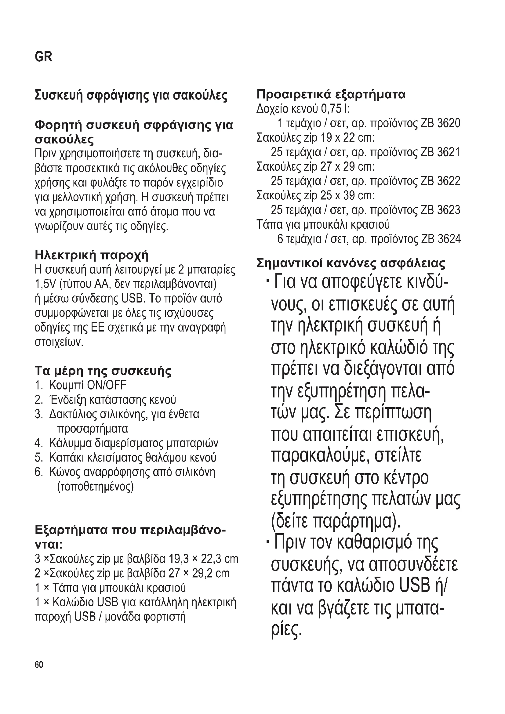 3 ×Σακούλες zip με βαλβίδα 19,3 × 22,3 cm 2 ×Σακούλες zip με βαλβίδα 27 × 29,2 cm 1 × Τάπα για μπουκάλι κρασιού 1 × Καλώδιο USB για κατάλληλη ηλεκτρική παροχή USB / μονάδα φορτιστή Προαιρετικά εξαρτήματα Δοχείο κενού 0,75 l: 1 τεμάχιο / σετ, αρ. προϊόντος ZB 3620 Σακούλες zip 19 x 22 cm: 25 τεμάχια / σετ, αρ. προϊόντος ZB 3621 Σακούλες zip 27 x 29 cm: 25 τεμάχια / σετ, αρ. προϊόντος ZB 3622 Σακούλες zip 25 x 39 cm: 25 τεμάχια / σετ, αρ. προϊόντος ZB 3623 Τάπα για μπουκάλι κρασιού 6 τεμάχια / σετ, αρ. προϊόντος ZB 3624 Σημαντικοί κανόνες ασφάλειας ∙ Για να αποφεύγετε κινδύ- νους, οι επισκευές σε αυτή την ηλεκτρική συσκευή ή στο ηλεκτρικό καλώδιό της πρέπει να διεξάγονται από την εξυπηρέτηση πελα- τών μας. Σε περίπτωση που απαιτείται επισκευή, παρακαλούμε, στείλτε τη συσκευή στο κέντρο εξυπηρέτησης πελατών μας (δείτε παράρτημα). ∙ Πριν τον καθαρισμό της συσκευής, να αποσυνδέετε πάντα το καλώδιο USB ή/ και να βγάζετε τις μπατα-