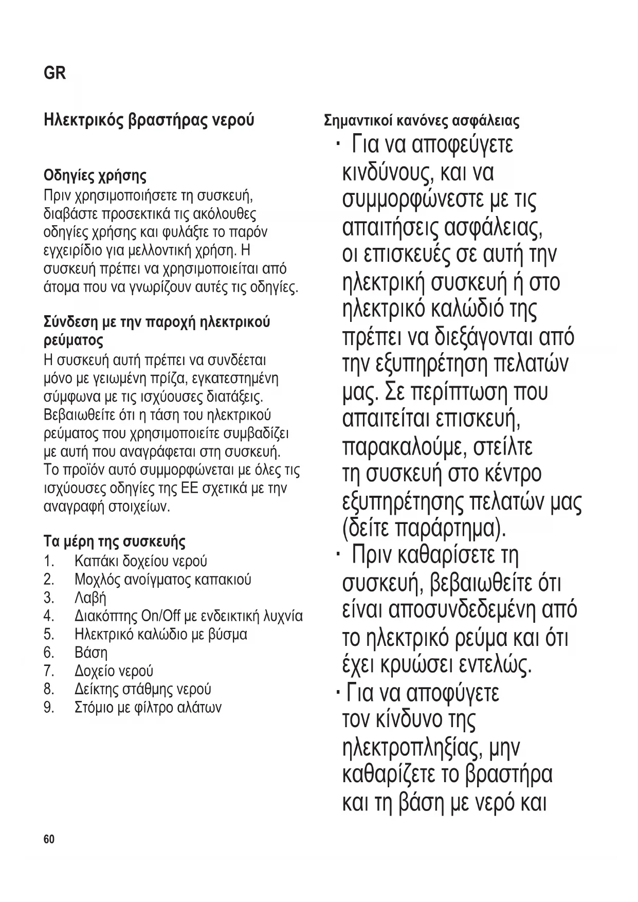 Σημαντικοί κανόνες ασφάλειας ∙ Γιανααποφεύγετε κινδύνους,καινα συμμορφώνεστεμετις απαιτήσειςασφάλειας, οιεπισκευέςσεαυτήτην ηλεκτρικήσυσκευήήστο ηλεκτρικόκαλώδιότης πρέπειναδιεξάγονταιαπό τηνεξυπηρέτησηπελατών μας.Σεπερίπτωσηπου απαιτείταιεπισκευή, παρακαλούμε,στείλτε τησυσκευήστοκέντρο εξυπηρέτησηςπελατώνμας (δείτεπαράρτημα). ∙ Πρινκαθαρίσετετη συσκευή,βεβαιωθείτεότι είναιαποσυνδεδεμένηαπό τοηλεκτρικόρεύμακαιότι έχεικρυώσειεντελώς. ∙ Γιανααποφύγετε τονκίνδυνοτης ηλεκτροπληξίας,μην καθαρίζετετοβραστήρα καιτηβάσημενερόκαι GR104 x 142 mm