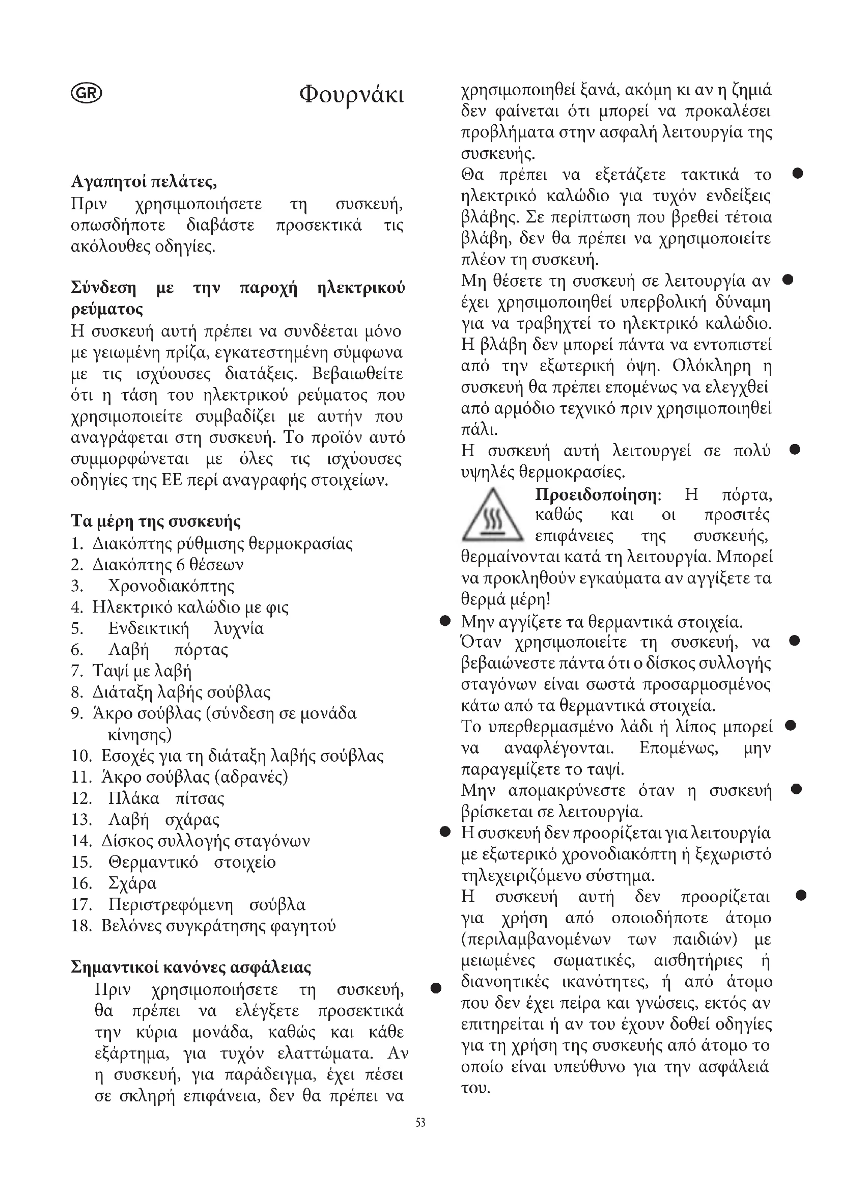 Η συσκευή αυτή λειτουργεί σε πολύ z υψηλές θερμοκρασίες. Προειδοποίηση: Η πόρτα, καθώς και οι προσιτές επιφάνειες της συσκευής, θερμαίνονται κατά τη λειτουργία. Μπορεί να προκληθούν εγκαύματα αν αγγίξετε τα θερμά μέρη! Μην z αγγίζετε τα θερμαντικά στοιχεία. Όταν χρησιμοποιείτε τη συσκευή, να z βεβαιώνεστε πάντα ότι ο δίσκος συλλογής σταγόνων είναι σωστά προσαρμοσμένος κάτω από τα θερμαντικά στοιχεία. Το υπερθερμασμένο λάδι ή λίπος μπορεί z να αναφλέγονται. Επομένως, μην παραγεμίζετε το ταψί. Μην απομακρύνεστε όταν η συσκευή z βρίσκεται σε λειτουργία. Η συσκευή δεν προορίζεται για λειτουργία z με εξωτερικό χρονοδιακόπτη ή ξεχωριστό τηλεχειριζόμενο σύστημα. Η συσκευή αυτή δεν προορίζεται z για χρήση από οποιοδήποτε άτομο (περιλαμβανομένων των παιδιών) με μειωμένες σωματικές, αισθητήριες ή διανοητικές ικανότητες, ή από άτομο που δεν έχει πείρα και γνώσεις, εκτός αν επιτηρείται ή αν του έχουν δοθεί οδηγίες για τη χρήση της συσκευής από άτομο το οποίο είναι υπεύθυνο για την ασφάλειά