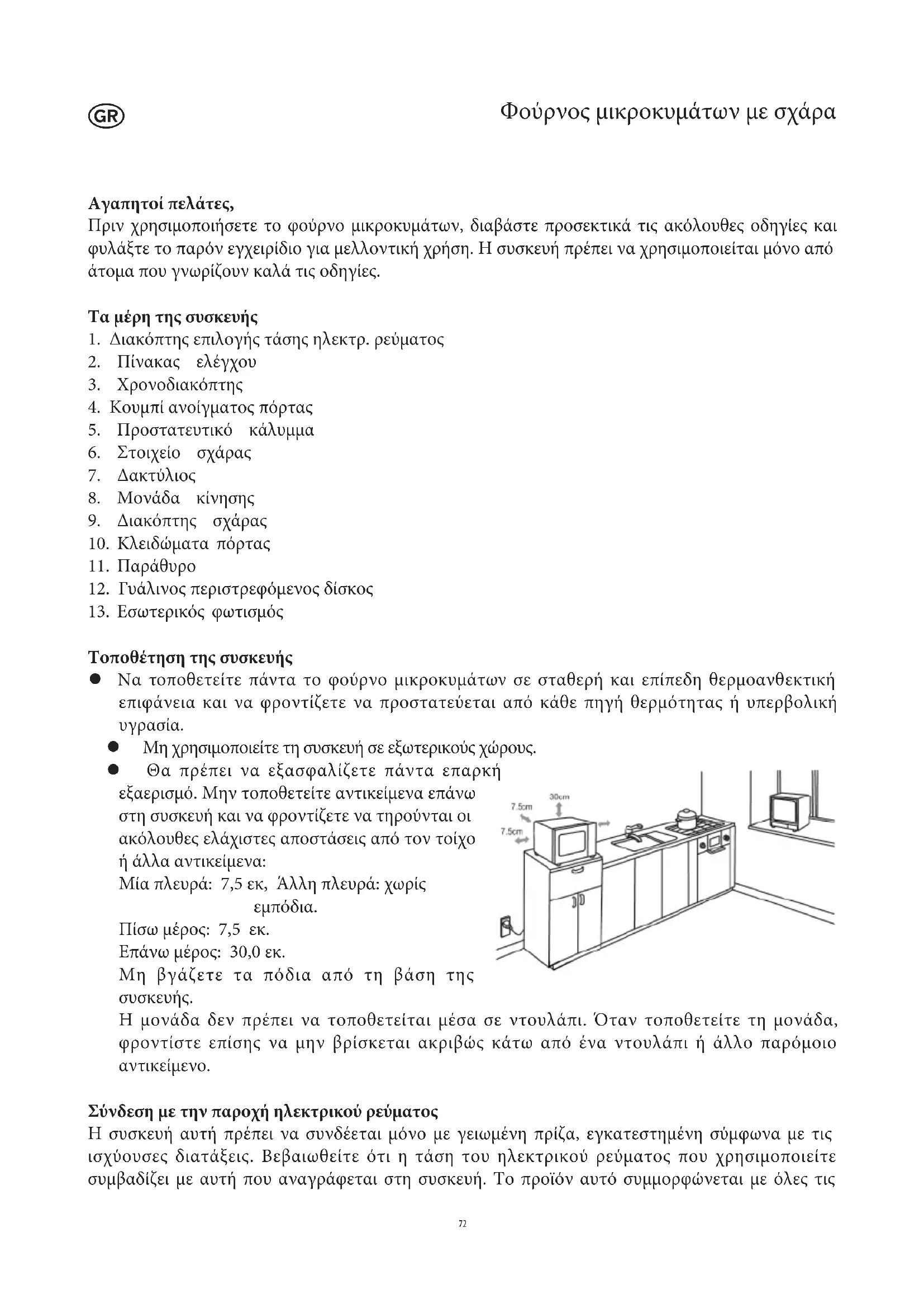 Τοποθέτηση της συσκευής Να τοποθετείτε πάντα το φούρνο μικροκυμάτων σε σταθερή και επίπεδη θερμοανθεκτική επιφάνεια και να φροντίζετε να προστατεύεται από κάθε πηγή θερμότητας ή υπερβολική