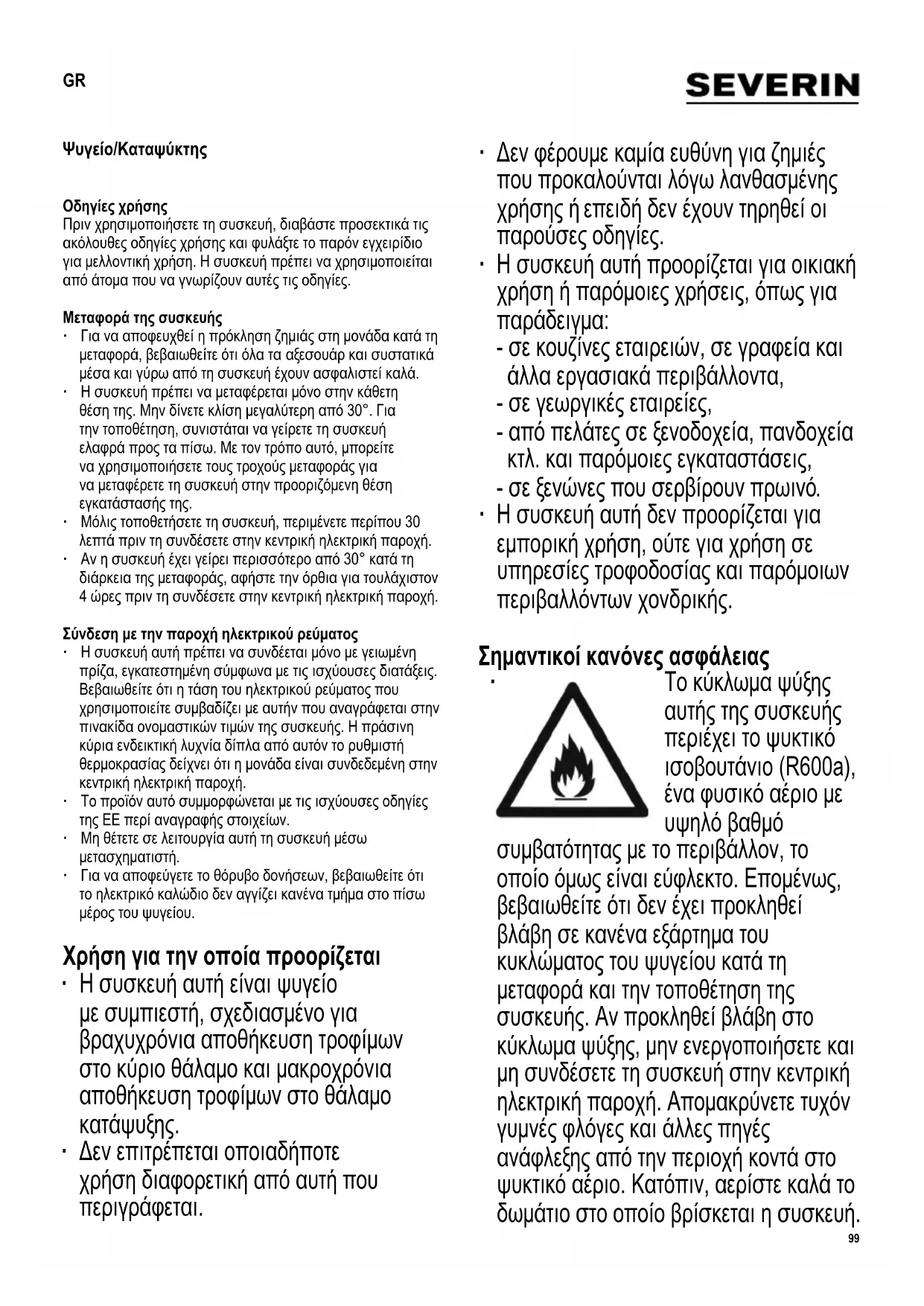 Το κύκλωμα ψύξης αυτής της συσκευής περιέχει το ψυκτικό ισοβουτάνιο (R600a), ένα φυσικό αέριο με υψηλό βαθμό συμβατότητας με το περιβάλλον, το οποίο όμως είναι εύφλεκτο. Επομένως, βεβαιωθείτε ότι δεν έχει προκληθεί βλάβη σε κανένα εξάρτημα του κυκλώματος του ψυγείου κατά τη μεταφορά και την τοποθέτηση της συσκευής. Αν προκληθεί βλάβη στο κύκλωμα ψύξης, μην ενεργοποιήσετε και μη συνδέσετε τη συσκευή στην κεντρική ηλεκτρική παροχή. Απομακρύνετε τυχόν γυμνές φλόγες και άλλες πηγές ανάφλεξης από την περιοχή κοντά στο ψυκτικό αέριο. Κατόπιν, αερίστε καλά το δωμάτιο στο οποίο βρίσκεται η συσκευή. GR100 ∙ Προειδοποίηση: Δεν πρέπει να εμποδίζονται με κανέναν τρόπο τα ανοίγματα εξαερισμού στο περίβλημα ή στη δομή της συσκευής. Θα πρέπει να εξασφαλίζετε πάντα επαρκή εξαερισμό. ∙ Προειδοποίηση: Μην προκαλείτε βλάβη στο κύκλωμα ψύξης. Τυχόν διαρροή ψυκτικού μπορεί να προκαλέσει βλάβη στα μάτια. Επίσης, υπάρχει και ο κίνδυνος ανάφλεξης του