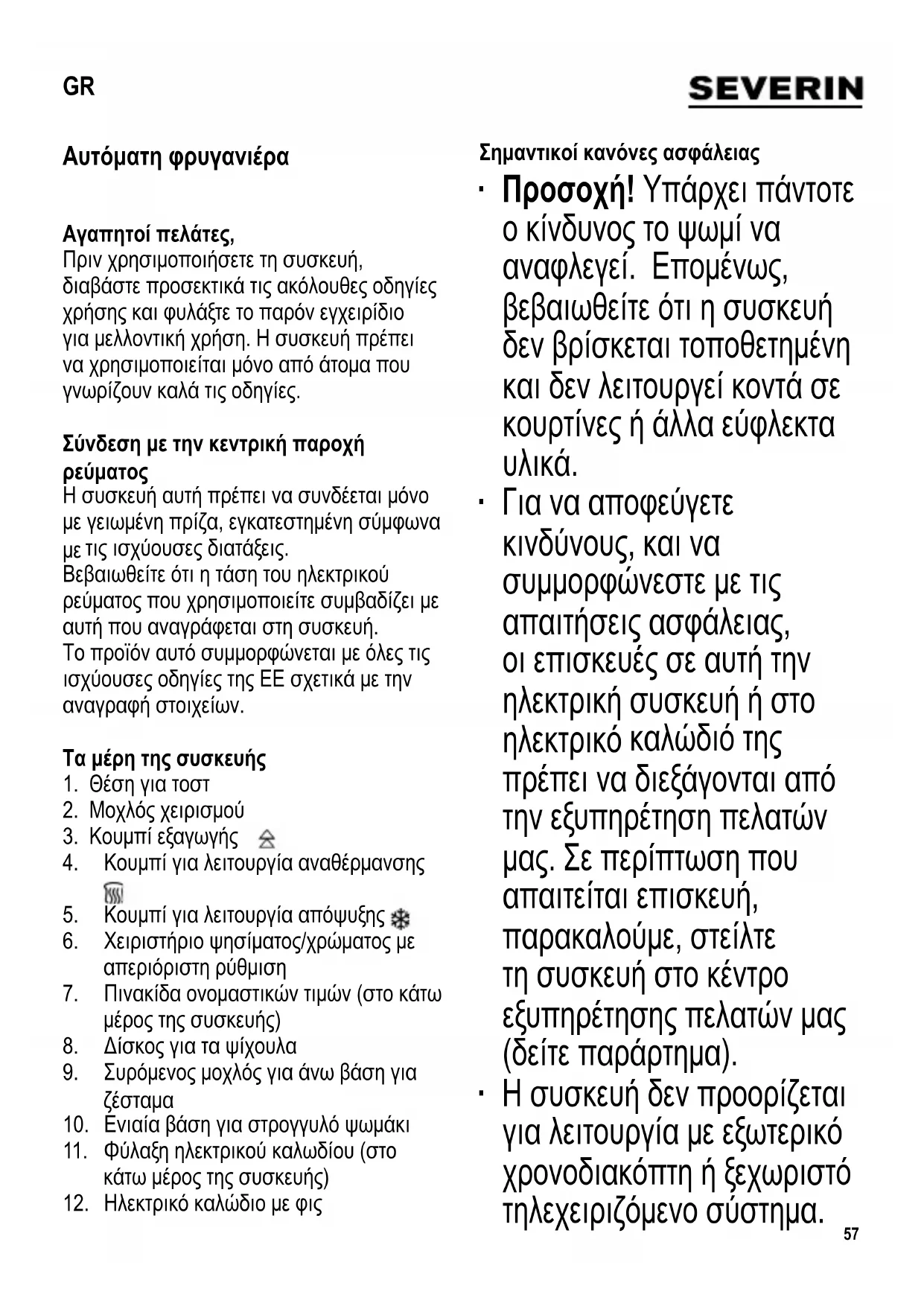 Γενικές πληροφορίες ∙ Προσοχή! Ο μοχλός λειτουργίας ασφαλίζει μόνο όταν το φις του ηλεκτρικού καλωδίου είναι συνδεδεμένο σε πρίζα.60 ∙ Μη χρησιμοποιείτε πολύ χοντρές ή πολύ μεγάλες φέτες ψωμί, επειδή μπορεί να σφηνώσουν μέσα στη φρυγανιέρα. Το πάχος που πρέπει να έχουν οι φέτες ψωμί για ψήσιμο δεν πρέπει να ξεπερνά τα 14 χιλιοστά. ∙ Να βγάζετε πάντα το φις του ηλεκτρικού καλωδίου της συσκευής από την πρίζα σε περίπτωση που έχετε προβλήματα ή παρουσιαστεί κάποια ανωμαλία κατά τη χρήση και πριν από τον καθαρισμό. ∙ Για να βγάλετε μια φέτα που σφηνώθηκε στη φρυγανιέρα, χρησιμοποιήστε ένα αμβλύ ξύλινο εργαλείο (π.χ. το χερούλι μιας βούρτσας). Ποτέ μην αγγίζετε τα μεταλλικά θερμαντικά στοιχεία. Πριν χρησιμοποιήσετε τη συσκευή για