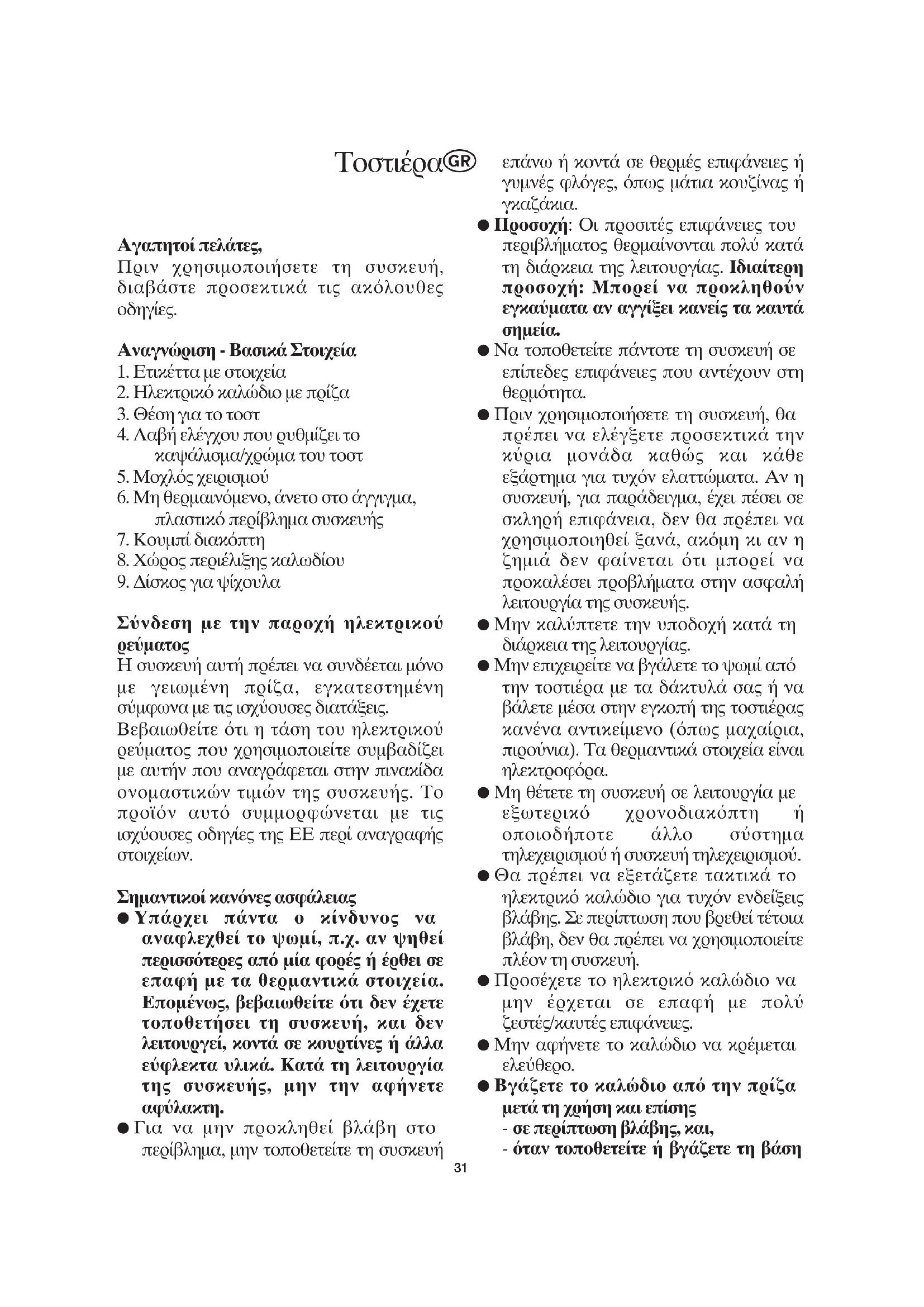 ● Πριν χρησιμοποισετε τη συσκευ, θα πρπει να ελγξετε προσεκτικ την κ'ρια μονδα καθ!ς και κθε εξρτημα για τυχν ελαττ!ματα. Αν η συσκευ, για παρδειγμα, χει πσει σε σκληρ επιφνεια, δεν θα πρπει να χρησιμοποιηθε ξαν, ακμη κι αν η ζημι δεν φανεται τι μπορε να προκαλσει προβλματα στην ασφαλ λειτουργα της συσκευς. ● Μην καλ'πτετε την υποδοχ κατ τη διρκεια της λειτουργας. ● Μην επιχειρετε να βγλετε το ψωμ απ την τοστιρα με τα δκτυλ σας να βλετε μσα στην εγκοπ της τοστιρας καννα αντικεμενο (πως μαχαρια, πιρο'νια). Τα θερμαντικ στοιχεα εναι ηλεκτροφρα. ● Μη θτετε τη συσκευ σε λειτουργα με εξωτερικ χρονοδιακπτη οποιοδποτε λλο σ'στημα τηλεχειρισμο' συσκευ τηλεχειρισμο'. ● Θα πρπει να εξετζετε τακτικ το ηλεκτρικ καλ!διο για τυχν ενδεξεις βλβης. Σε περπτωση που βρεθε ττοια βλβη, δεν θα πρπει να χρησιμοποιετε πλον τη συσκευ. ● Προσχετε το ηλεκτρικ καλ!διο να μην ρχεται σε επαφ με πολ' ζεστς/καυτς επιφνειες. ● Μην αφνετε το καλ!διο να κρμεται