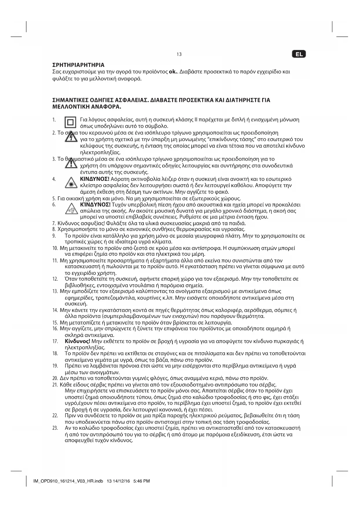 ή από τον αντιπρόσωπό του για το σέρβις ή από άτομο με παρόμοια εξειδίκευση, έτσι ώστε να αποφευχθεί τυχόν κίνδυνος. IM_OPD910_161214_V03_HR.indb 13 14/12/16 5:46 PM14