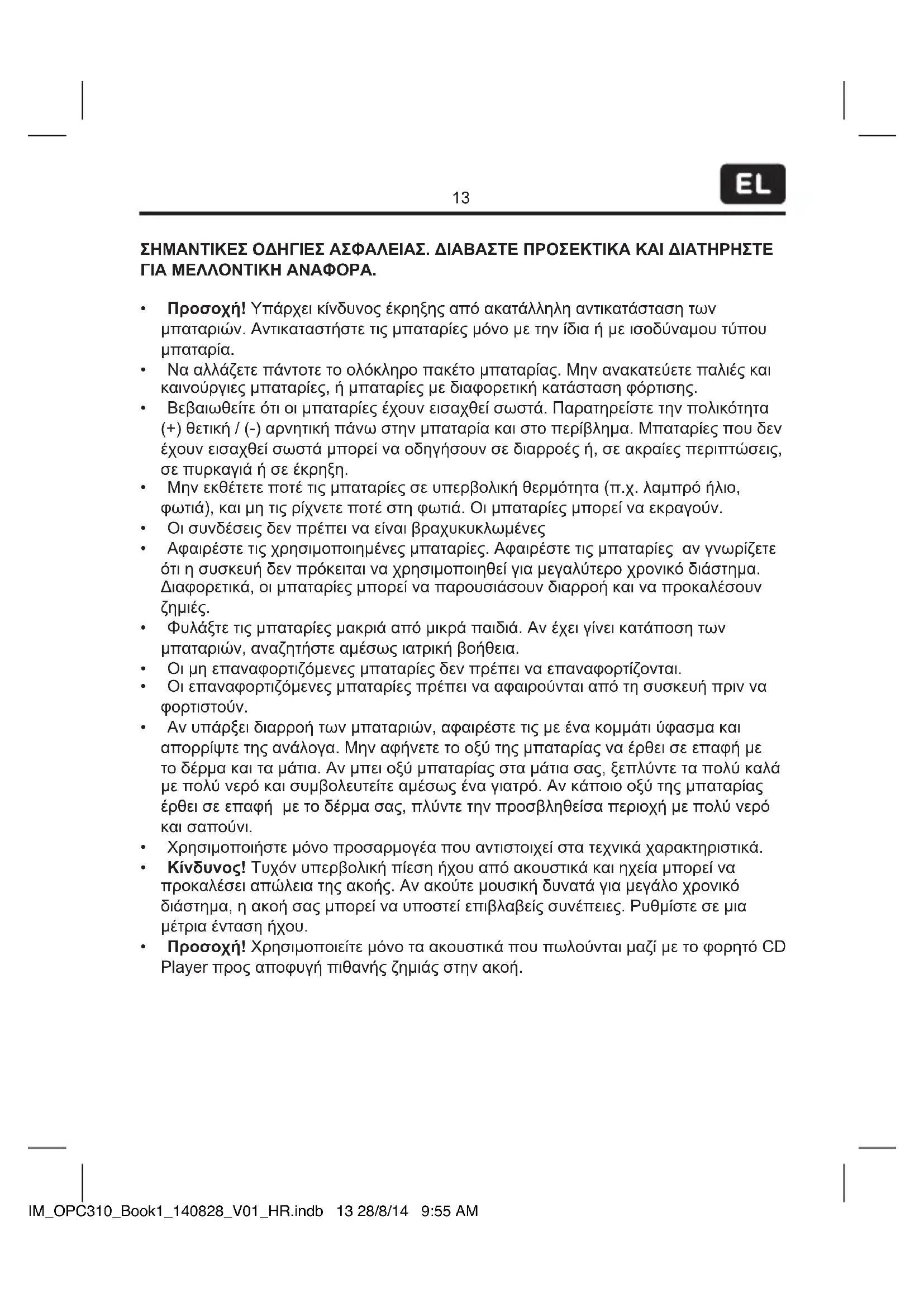 - Προσοχή!ΧρησιμοποιείτεμόνοταακουστικάπουπωλούνταιμαζίμετοφορητόCD Playerπροςαποφυγήπιθανήςζημιάςστηνακοή. IM_OPC310_Book1_140828_V01_HR.indb 13 28/8/14 9:55 AM14 ΣΥΓΧΑΡΗΤΉΡΙΑ Σαςευχαριστούμεπουεπιλέξατεέναπροϊόν Παρακαλούμεδιαβάστεαυτέςτις οδηγίεςπροσεκτικάκαιφυλάξτετιςγιαμελλοντικήχρήση. ΠΡΟΤΙΘΈΜΕΝΗ ΧΡΉΣΗ Τοπροϊόναυτόπροορίζεταιμόνογιαηχητικήψυχαγωγία.Οποιαδήποτεάλληχρήση ενδέχεταιναπροκαλέσειβλάβηστοπροϊόνήτραυματισμό.