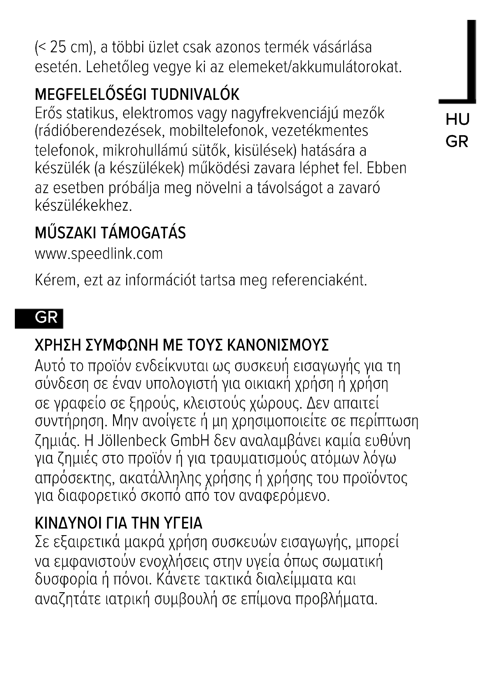 ΧΡΉΣΉ ΣΎΜΦΩΝΉ ΜΕ ΤΟΎΣ ΚΑΝΟΝΙΣΜΟΎΣ Αυτό το προϊόν ενδείκνυται ως συσκευή εισαγωγής για τη σύνδεση σε έναν υπολογιστή για οικιακή χρήση ή χρήση σε γραφείο σε ξηρούς, κλειστούς χώρους. Δεν απαιτεί συντήρηση. Μην ανοίγετε ή μη χρησιμοποιείτε σε περίπτωση ζημιάς. Η Jöllenbeck GmbH δεν αναλαμβάνει καμία ευθύνη για ζημιές στο προϊόν ή για τραυματισμούς ατόμων λόγω απρόσεκτης, ακατάλληλης χρήσης ή χρήσης του προϊόντος για διαφορετικό σκοπό από τον αναφερόμενο. ΚΙΝΔΎΝΟΙ ΓΙΑ ΤΉΝ ΎΓΕΙΑ Σε εξαιρετικά μακρά χρήση συσκευών εισαγωγής, μπορεί να εμφανιστούν ενοχλήσεις στην υγεία όπως σωματική δυσφορία ή πόνοι. Κάνετε τακτικά διαλείμματα και αναζητάτε ιατρική συμβουλή σε επίμονα προβλήματα.ΑΠΟΡΡΙΨΉ Το σύμβολο αυτό σημαίνει ότι το προϊόν δεν επιτρέπεται να απορρίπτεται με τα οικιακά απορρίμματα. Ακατάλληλη αποθήκευση/απόρριψη παλαιών συσκευών ή μπαταριών/ συσσωρευτών μπορεί, λόγω ενδεχόμενα υφιστάμενων επιβλαβών ουσιών, να προκαλέσει ζημιά στο περιβάλλον και/ή στην ανθρώπινη υγεία και να οδηγήσει σε κυρώσεις σύμφωνα με τη νομοθεσία. Η παράδοση σε μια επίσημη υπηρεσία συλλογής είναι δωρεάν και είναι υποχρεωτική νομικά, εξασφαλίζει τη σωστή απόρριψη ή ανακύκλωση/επαναχρησιμοποίηση και συνεισφέρει στην προστασία του περιβάλλοντος. Πληροφορίες μπορείτε να λάβετε από τις αρχές, τα κέντρα διάθεσης απορριμμάτων ή τα εξειδικευμένα καταστήματα. Τα μεγάλα καταστήματα λιανικής (καταστήματα ηλεκτρικών και ηλεκτρονικών ειδών με μια επιφάνεια ≥ 400m²) παραλαμβάνουν δωρεάν τις μικρές συσκευές (όλες οι διαστάσεις < 25εκ.) και άλλα μόνο στην περίπτωση αγοράς παρόμοιων προϊόντων. Αφαιρείτε εφόσον είναι δυνατό τις μπαταρίες/τους συσσωρευτές. ΎΠΟΔΕΙΞΉ ΣΎΜΜΟΡΦΩΣΉΣ Υπό την επίδραση δυνατών στατικών, ηλεκτρικών πεδίων ή πεδίων υψηλής συχνότητας (ασύρματες εγκαταστάσεις, κινητά τηλέφωνα, αποφορτίσεις συσκευών μικροκυμάτων) ίσως υπάρξουν επιδράσεις στη λειτουργία της συσκευής (των συσκευών). Σε αυτή την περίπτωση δοκιμάστε να αυξήσετε την απόσταση προς τις συσκευές που δημιουργούν παρεμβολή. ΤΕΧΝΙΚΉ ΎΠΟΣΤΉΡΙΞΉ www.speedlink.com Παρακαλούμε φυλάξτε αυτές τις πληροφορίες για μελλοντική αναφορά.CZ