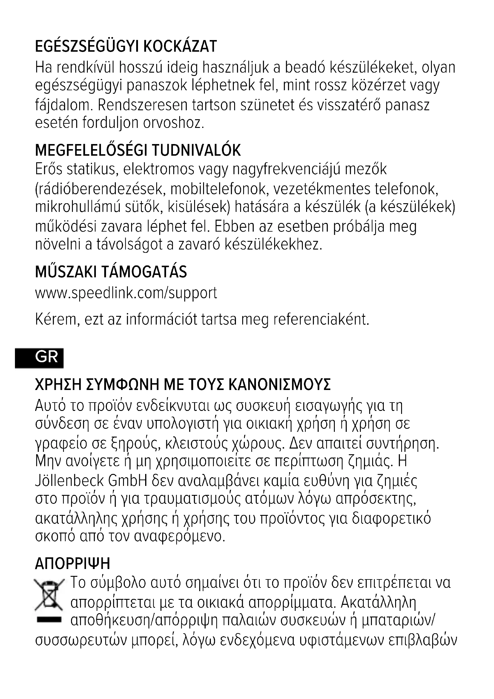 Το σύμβολο αυτό σημαίνει ότι το προϊόν δεν επιτρέπεται να απορρίπτεται με τα οικιακά απορρίμματα. Ακατάλληλη αποθήκευση/απόρριψη παλαιών συσκευών ή μπαταριών/ συσσωρευτών μπορεί, λόγω ενδεχόμενα υφιστάμενων επιβλαβώνGR ουσιών, να προκαλέσει ζημιά στο περιβάλλον και/ή στην ανθρώπινη υγεία και να οδηγήσει σε κυρώσεις σύμφωνα με τη νομοθεσία. Η παράδοση σε μια επίσημη υπηρεσία συλλογής είναι δωρεάν και είναι υποχρεωτική νομικά, εξασφαλίζει τη σωστή απόρριψη ή ανακύκλωση/ επαναχρησιμοποίηση και συνεισφέρει στην προστασία του περιβάλλοντος. Πληροφορίες μπορείτε να λάβετε από τις αρχές, τα κέντρα διάθεσης απορριμμάτων ή τα εξειδικευμένα καταστήματα. Τα μεγάλα καταστήματα λιανικής (καταστήματα ηλεκτρικών και ηλεκτρονικών ειδών με μια επιφάνεια ≥ 400m²) παραλαμβάνουν δωρεάν τις μικρές συσκευές (όλες οι διαστάσεις < 25εκ.) και άλλα μόνο στην περίπτωση αγοράς παρόμοιων προϊόντων. Αφαιρείτε εφόσον είναι δυνατό τις μπαταρίες/τους συσσωρευτές. ΚΙΝΔΎΝΟΙ ΓΙΑ ΤΉΝ ΎΓΕΙΑ Σε εξαιρετικά μακρά χρήση συσκευών εισαγωγής, μπορεί να εμφανιστούν ενοχλήσεις στην υγεία όπως σωματική δυσφορία ή πόνοι. Κάνετε τακτικά διαλείμματα και αναζητάτε ιατρική συμβουλή σε επίμονα προβλήματα. ΎΠΟΔΕΙΞΉ ΣΎΜΜΟΡΦΩΣΉΣ Υπό την επίδραση δυνατών στατικών, ηλεκτρικών πεδίων ή πεδίων υψηλής συχνότητας (ασύρματες εγκαταστάσεις, κινητά τηλέφωνα, αποφορτίσεις συσκευών μικροκυμάτων) ίσως υπάρξουν επιδράσεις στη λειτουργία της συσκευής (των συσκευών). Σε αυτή την περίπτωση δοκιμάστε να αυξήσετε την απόσταση προς τις συσκευές που δημιουργούν παρεμβολή. ΤΕΧΝΙΚΉ ΎΠΟΣΤΉΡΙΞΉ www.speedlink.com/support Παρακαλούμε φυλάξτε αυτές τις πληροφορίες για μελλοντική αναφορά.CZ