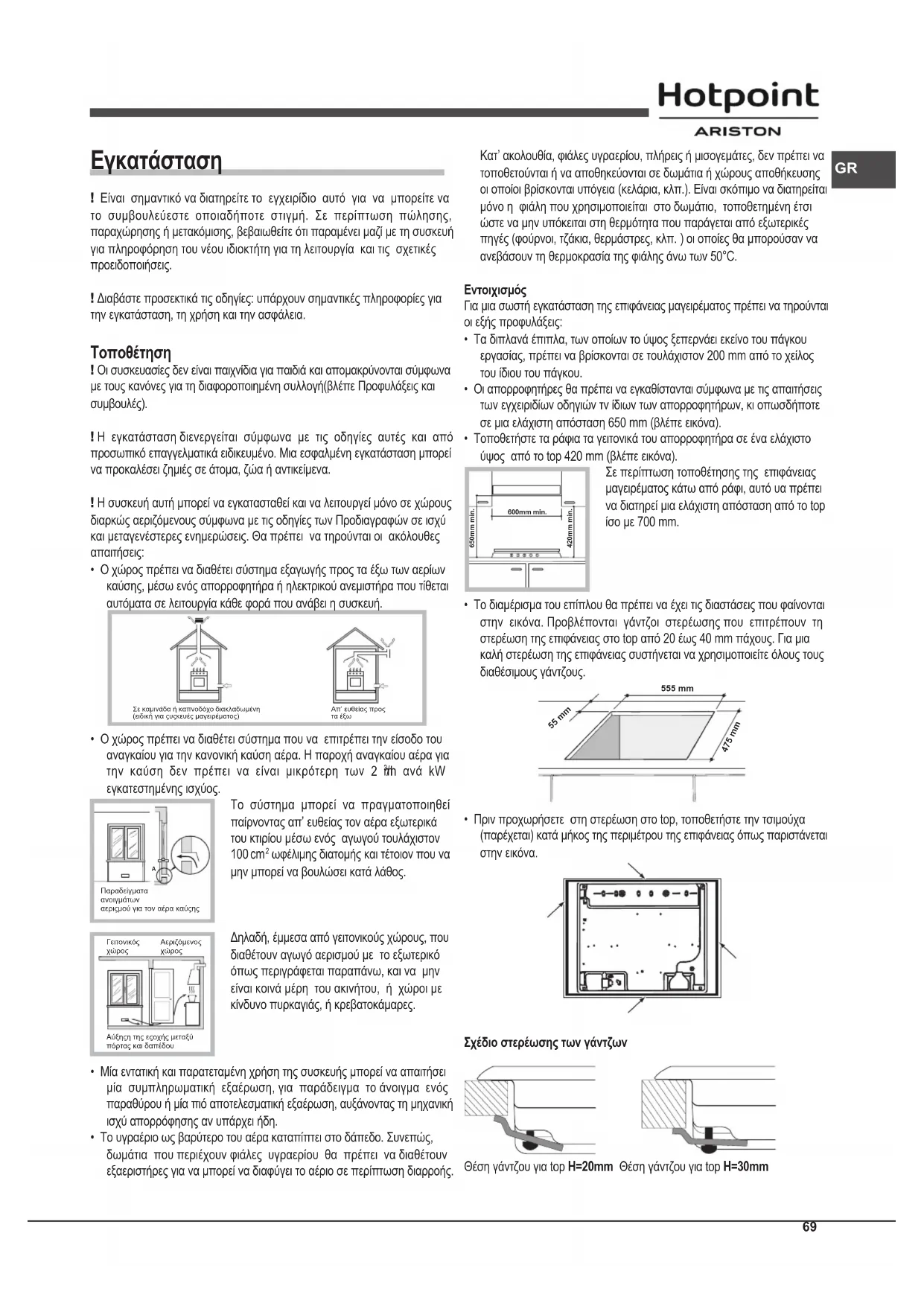- Οι συσκευές αερίου απαιτούν, για τη σωστή λειτουργία, κανονική ανανέωση του αέρα. Βεβαιωθείτε ότι κατά την εγκατάστασή τους πληρούνται οι απαιτήσεις της παραγράφου που σχετίζεται με την “Τοποθέτηση”.