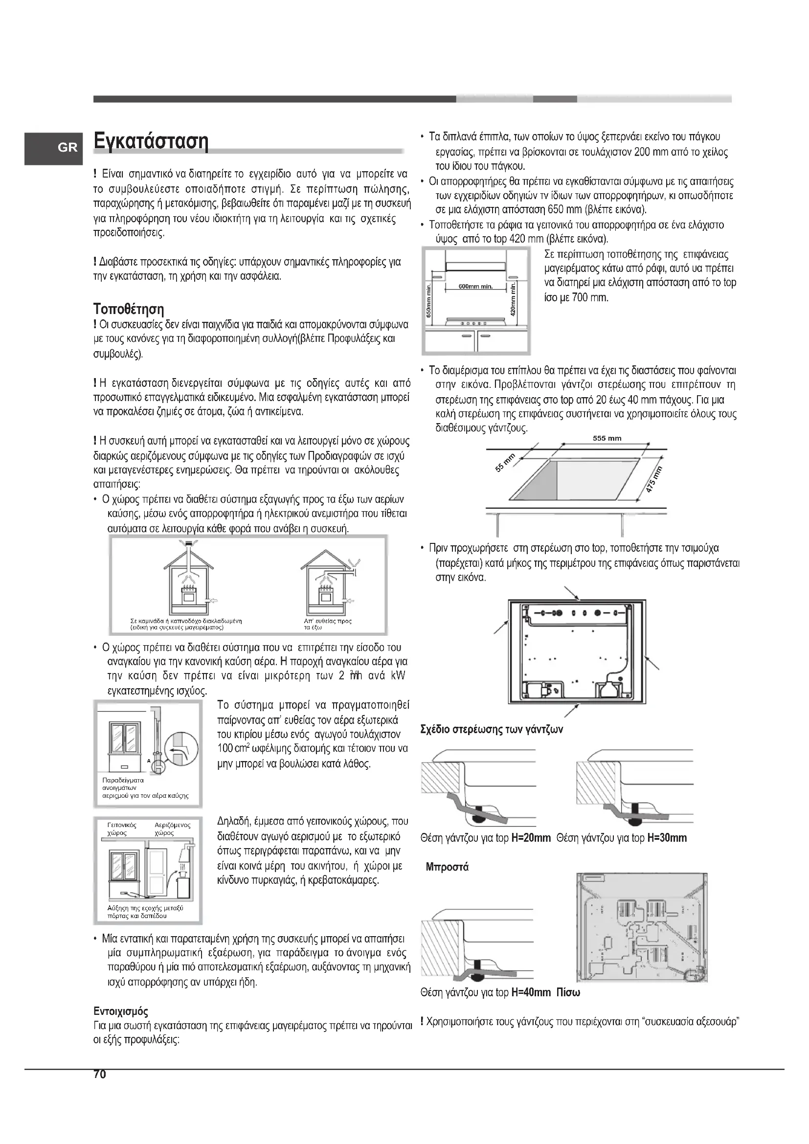 - Οι συσκευές αερίου απαιτούν, για τη σωστή λειτουργία, κανονική ανανέωση του αέρα. Βεβαιωθείτε ότι κατά την εγκατάστασή τους πληρούνται οι απαιτήσεις της παραγράφου που σχετίζεται με την “Τοποθέτηση”.