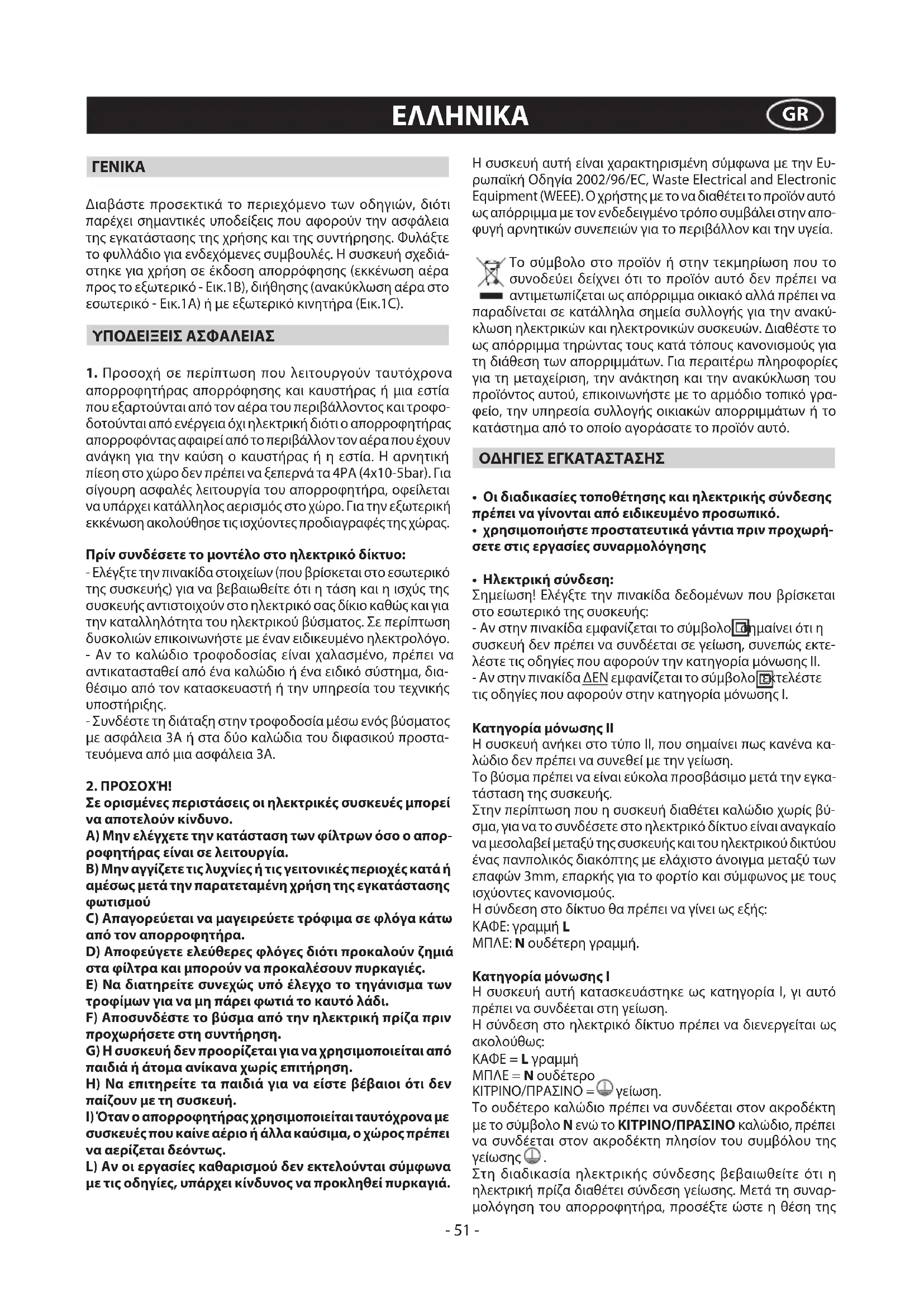συσκευές που καίνε αέριο ή άλλα καύσιμα, ο χώρος πρέπει να αερίζεται δεόντως. L) Αν οι εργασίες καθαρισμού δεν εκτελούνται σύμφωνα με τις οδηγίες, υπάρχει κίνδυνος να προκληθεί πυρκαγιά. Η συσκευή αυτή είναι χαρακτηρισμένη σύμφωνα με την Ευ- ρωπαϊκή Οδηγία 2002/96/EC, Waste Electrical and Electronic Equipment (WEEE). Ο χρήστης με το να διαθέτει το προϊόν αυτό ως απόρριμμα με τον ενδεδειγμένο τρόπο συμβάλει στην απο- φυγή αρνητικών συνεπειών για το περιβάλλον και την υγεία. Το σύμβολο στο προϊόν ή στην τεκμηρίωση που το συνοδεύει δείχνει ότι το προϊόν αυτό δεν πρέπει να αντιμετωπίζεται ως απόρριμμα οικιακό αλλά πρέπει να παραδίνεται σε κατάλληλα σημεία συλλογής για την ανακύ- κλωση ηλεκτρικών και ηλεκτρονικών συσκευών. Διαθέστε το ως απόρριμμα τηρώντας τους κατά τόπους κανονισμούς για τη διάθεση των απορριμμάτων. Για περαιτέρω πληροφορίες για τη μεταχείριση, την ανάκτηση και την ανακύκλωση του προϊόντος αυτού, επικοινωνήστε με το αρμόδιο τοπικό γρα- φείο, την υπηρεσία συλλογής οικιακών απορριμμάτων ή το κατάστημα από το οποίο αγοράσατε το προϊόν αυτό. ΟΔΗΓΙΕΣ ΕΓΚΑΤΑΣΤΑΣΗΣ