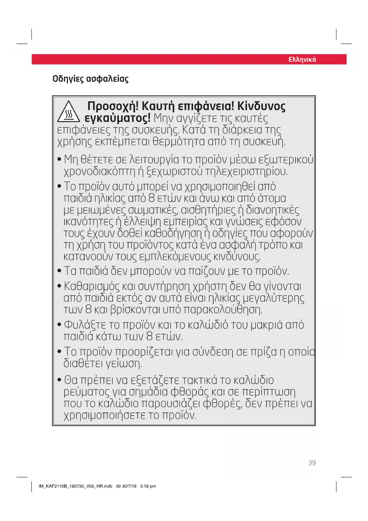 - Για να μειωθεί ο κίνδυνος πυρκαγιάς και ηλεκτροπληξίας, μην εκθέτετε το προϊόν σε φωτιά (τζάκι, σχάρα, κεριά, τσιγάρα κ.ο.κ) ή σε νερό (σταγόνες νερού, πιτσιλιές νερού, βάζα, μπανιέρες, δεξαμενές κ.ο.κ.). IM_KAF2110B_180730_V05_HR.indb 41 30/7/18 3:18 pmSize - A5