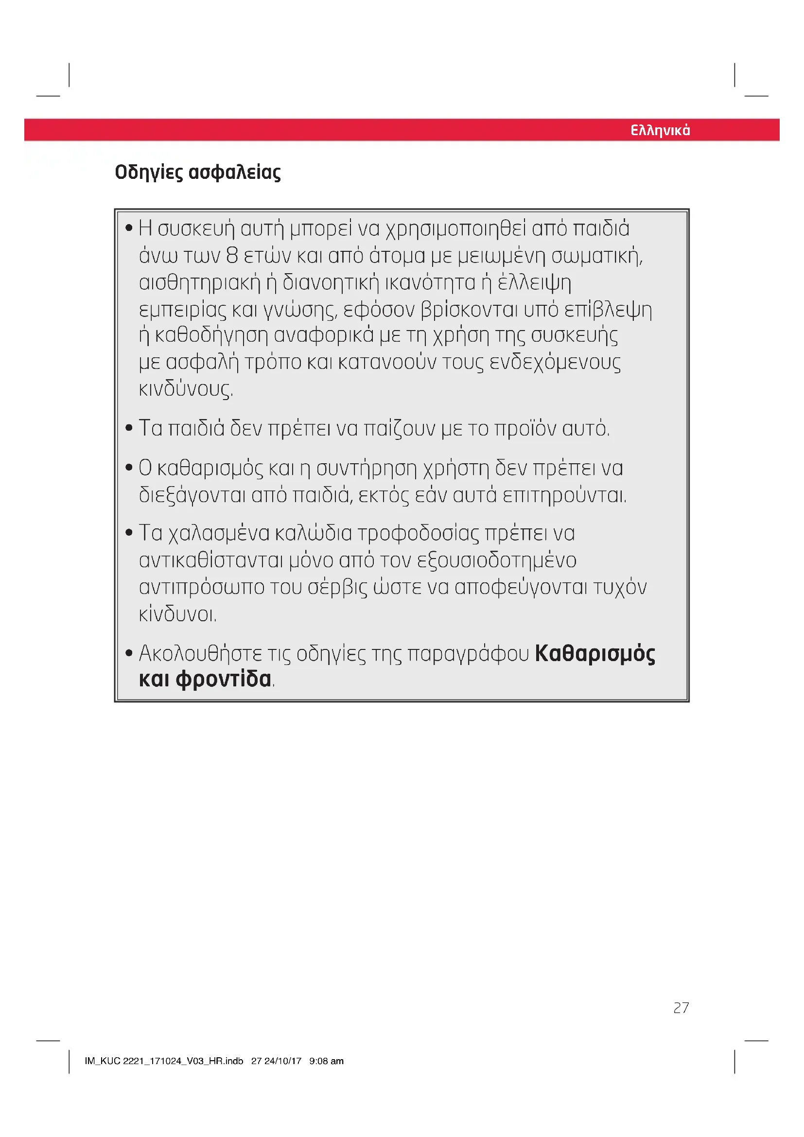 • Τα παιδιά δεν πρέπει να παίζουν με το προϊόν αυτό. - Ο καθαρισμός και η συντήρηση χρήστη δεν πρέπει να διεξάγονται από παιδιά, εκτός εάν αυτά επιτηρούνται.