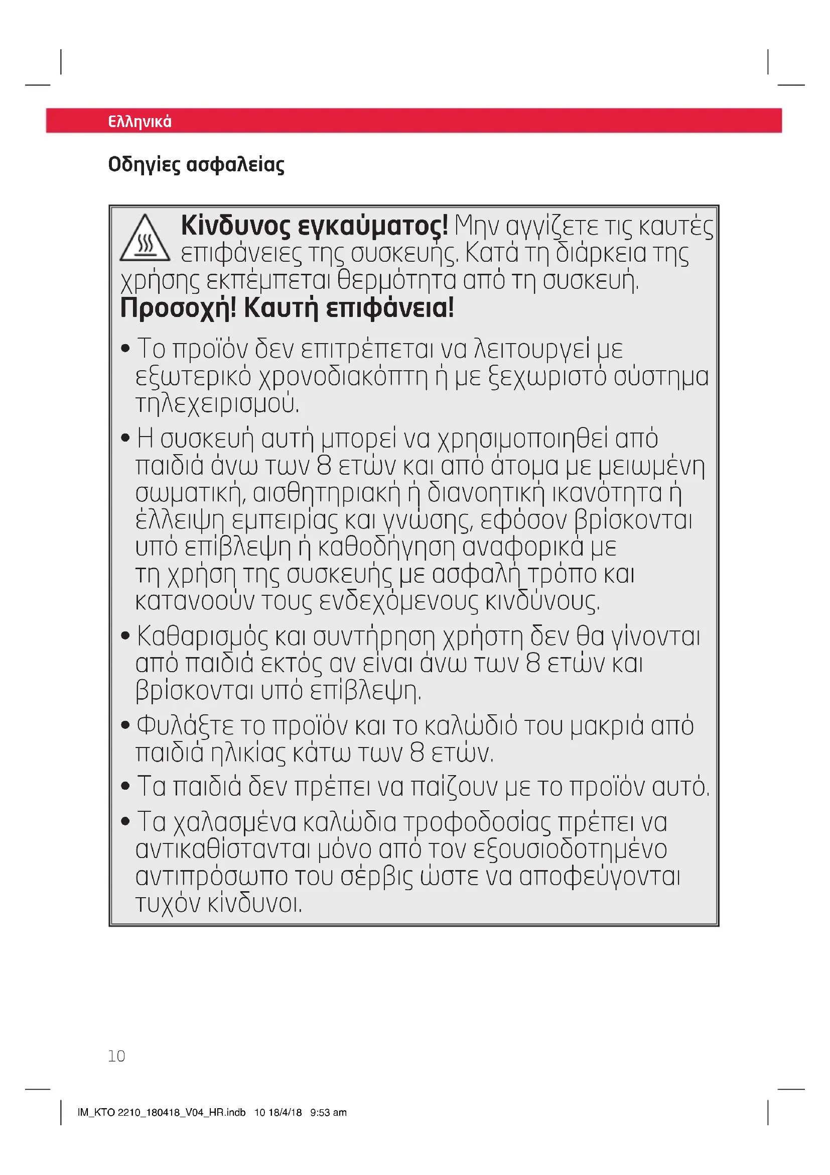 - Ακολουθήστε τις οδηγίες της παραγράφου Καθαρισμός και φροντίδα. Οδηγίες ασφαλείας IM_KTO 2210_180418_V04_HR.indb 11 18/4/18 9:53 amΕλληνικά
