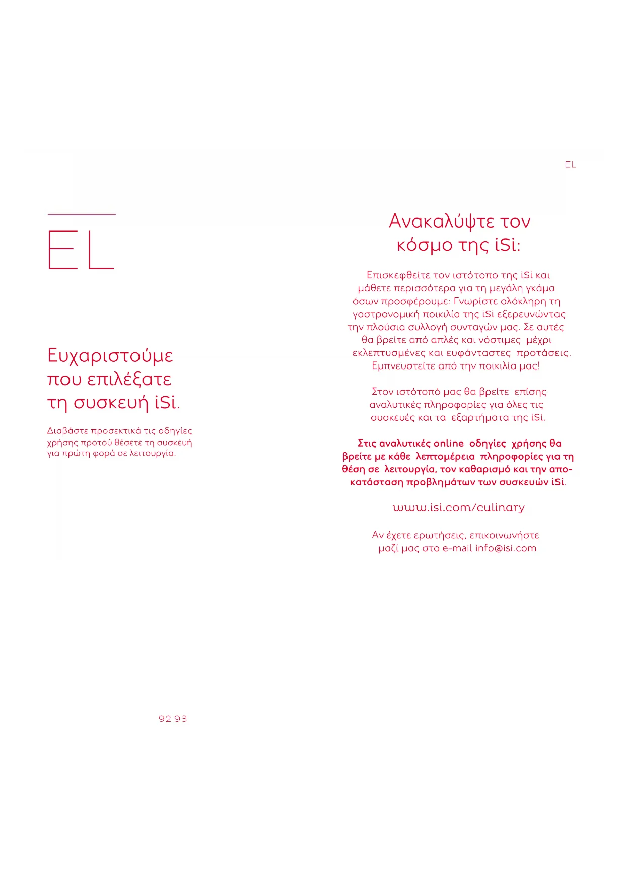 Ανακαλύψτε τον κόσμο της iSi: Επισκεφθείτε τον ιστότοπο της iSi και μάθετε περισσότερα για τη μεγάλη γκάμα όσων προσφέρουμε: Γνωρίστε ολόκληρη τη γαστρονομική ποικιλία της iSi εξερευνώντας την πλούσια συλλογή συνταγών μας. Σε αυτές θα βρείτε από απλές και νόστιμες μέχρι εκλεπτυσμένες και ευφάνταστες προτάσεις. Εμπνευστείτε από την ποικιλία μας! Στον ιστότοπό μας θα βρείτε επίσης αναλυτικές πληροφορίες για όλες τις συσκευές και τα εξαρτήματα της iSi. Στις αναλυτικές online οδηγίες χρήσης θα βρείτε με κάθε λεπτομέρεια πληροφορίες για τη θέση σε λειτουργία, τον καθαρισμό και την απο- κατάσταση προβλημάτων των συσκευών iSi. www.isi.com/culinary Αν έχετε ερωτήσεις, επικοινωνήστε μαζί μας στο e-mail info@isi.com Ευχαριστούμε που επιλέξατε τη συσκευή iSi. Διαβάστε προσεκτικά τις οδηγίες χρήσης προτού θέσετε τη συσκευή για πρώτη φορά σε λειτουργία.94 95 Στοιχεία συσκευής. Απλά εγγραφείτε και διασφαλίστε τα πλεονεκτήματα σας: www.isi.com/warranty