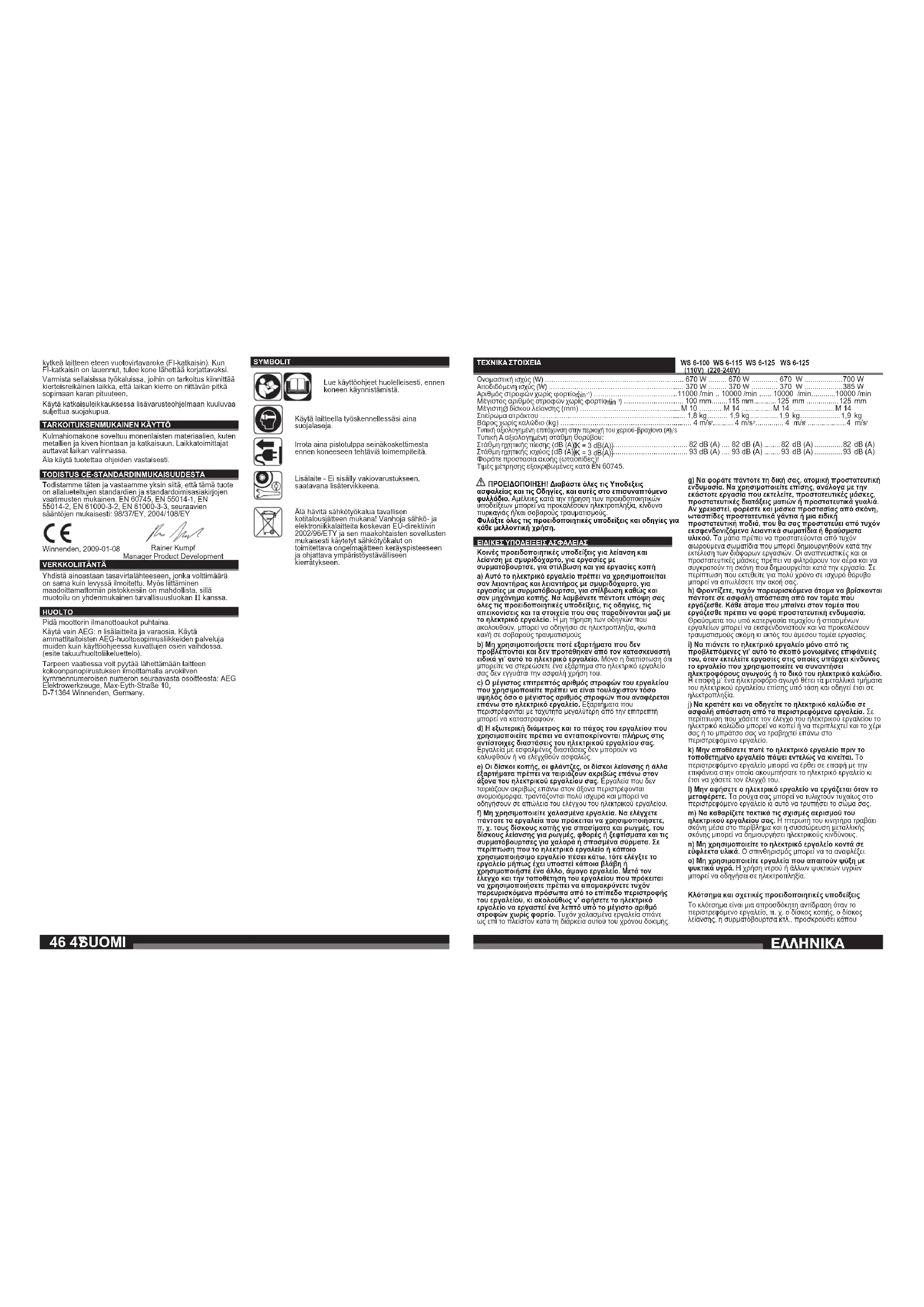 ÖïñÜôå ðñïóôáóßá áêïÞò (ùôáóðßäåò)! ÔéìÝò ìÝôñçóçò åîáêñéâùìÝíåò êáôÜ EN 60745. ΠΡΟEIΔΟΠΟIΗΣΗ! Διαβάστε όλες τις Υποδεξεις ασφαλείας και τις Οδηγίες, και αυτές στο επισυναπτόμενο φυλλάδιο. Αμέλειες κατά την τήρηση των προειδοποιητικών υποδείξεων μπορεί να προκαλέσουν ηλεκτροπληξία, κίνδυνο πυρκαγιάς ή/και σοβαρούς τραυματισμούς. Φυλάξτε όλες τις προειδοποιητικές υποδείξεις και οδηγίες για κάθε μελλοντική χρήση. ÅÉÄÉÊÅÓ ÕÐÏÄÅÉÎÅÉÓ ÁÓÖÁËÅÉÁÓ Κoινές πρoειδoπoιητικές υπoδείξεις για λείανση και λείανση με σμυριδόχαρτo, για εργασίες με συρματόβoυρτσε, για στίλβωση και για εργασίες κoπή a) Αυτό το ηλεκτρικό εργαλείο πρέπει να χρησιμοποιείται σαν λειαντήρας και λειαντήρας με σμυριδόχαρτο, για εργασίες με συρματόβουρτσα, για στίλβωση καθώς και σαν μηχάνημα κοπής. Να λαμβάνετε πάντοτε υπόψη σας όλες τις προειδοποιητικές υποδείξεις, τις οδηγίες, τις απεικονίσεις και τα στοιχεία που σας παραδίνονται μαζί με το ηλεκτρικό εργαλείο. Η μη τήρηση των οδηγιών που ακολουθούν, μπορεί να οδηγήσει σε ηλεκτροπληξία, φωτιά και/ή σε σοβαρούς τραυματισμούς b) Μη χρησιμοποιήσετε ποτέ εξαρτήματα που δεν προβλέπονται και δεν προτάθηκαν από τον κατασκευαστή ειδικά γι’ αυτό το ηλεκτρικό εργαλείο. Μόνο η διαπίστωση ότι μπορείτε να στερεώσετε ένα εξάρτημα στο ηλεκτρικό εργαλείο σας δεν εγγυάται την ασφαλή χρήση του. c) Ο μέγιστος επιτρεπτός αριθμός στροφών του εργαλείου που χρησιμοποιείτε πρέπει να είναι τουλάχιστον τόσο υψηλός όσο ο μέγιστος αριθμός στροφών που αναφέρεται επάνω στο ηλεκτρικό εργαλείο. Εξαρτήματα που περιστρέφονται με ταχύτητα μεγαλύτερη από την επιτρεπτή μπορεί να καταστραφούν. d) Η εξωτερική διάμετρος και το πάχος του εργαλείου που χρησιμοποιείτε πρέπει να ανταποκρίνονται πλήρως στις αντίστοιχες διαστάσεις του ηλεκτρικού εργαλείου σας. Εργαλεία με εσφαλμένες διαστάσεις δεν μπορούν να καλυφθούν ή να ελεγχθούν ασφαλώς. e) Οι δίσκοι κοπής, οι φλάντζες, οι δίσκοι λείανσης ή άλλα εξαρτήματα πρέπει να ταιριάζουν ακριβώς επάνω στον άξονα του ηλεκτρικού εργαλείου σας. Εργαλεία που δεν ταιριάζουν ακριβώς επάνω στον άξονα περιστρέφονται ανομοιόμορφα, τραντάζονται πολύ ισχυρά και μπορεί να οδηγήσουν σε απώλεια του ελέγχου του ηλεκτρικού εργαλείου. f) Μη χρησιμοποιείτε χαλασμένα εργαλεία. Να ελέγχετε πάντοτε τα εργαλεία που πρόκειται να χρησιμοποιήσετε, π. χ. τους δίσκους κοπής για σπασίματα και ρωγμές, του δίσκους λείανσης για ρωγμές, φθορές ή ξεφτίσματα και τις συρματόβουρτσες για χαλαρά ή σπασμένα σύρματα. Σε περίπτωση που το ηλεκτρικό εργαλείο ή κάποιο χρησιμοποιήσιμο εργαλείο πέσει κάτω, τότε ελέγξτε το εργαλείο μήπως έχει υποστεί κάποια βλάβη ή χρησιμοποιήστε ένα άλλο, άψογο εργαλείο. Μετά τον έλεγχο και την τοποθέτηση του εργαλείου που πρόκειται να χρησιμοποιήσετε πρέπει να απομακρύνετε τυχόν παρευρισκόμενα πρόσωπα από το επίπεδο περιστροφής του εργαλείου, κι ακολούθως ν’ αφήσετε το ηλεκτρικό εργαλείο να εργαστεί ένα λεπτό υπό το μέγιστο αριθμό στροφών χωρίς φορτίο. Τυχόν χαλασμένα εργαλεία σπάνε ως επί το πλείστον κατά τη διάρκεια αυτού του χρόνου δοκιμής. g) Να φοράτε πάντοτε τη δική σας, ατομική προστατευτική ενδυμασία. Να χρησιμοποιείτε επίσης, ανάλογα με την εκάστοτε εργασία που εκτελείτε, προστατευτικές μάσκες, προστατευτικές διατάξεις ματιών ή προστατευτικά γυαλιά. Αν χρειαστεί, φορέστε και μάσκα προστασίας από σκόνη, ωτασ