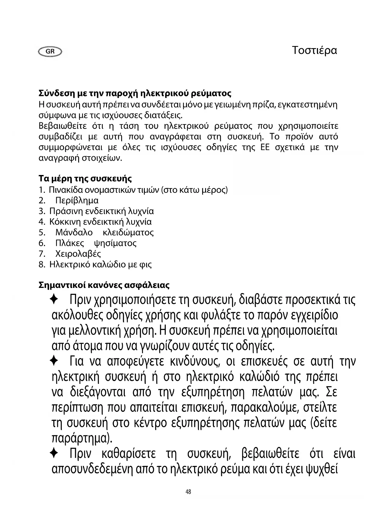 Σημαντικοί κανόνες ασφάλειας ✦ Πριν χρησιμοποιήσετε τη συσκευή, διαβάστε προσεκτικά τις ακόλουθες οδηγίες χρήσης και φυλάξτε το παρόν εγχειρίδιο για μελλοντική χρήση. Η συσκευή πρέπει να χρησιμοποιείται από άτομα που να γνωρίζουν αυτές τις οδηγίες. ✦ Για να αποφεύγετε κινδύνους, οι επισκευές σε αυτή την ηλεκτρική συσκευή ή στο ηλεκτρικό καλώδιό της πρέπει να διεξάγονται από την εξυπηρέτηση πελατών μας. Σε περίπτωση που απαιτείται επισκευή, παρακαλούμε, στείλτε τη συσκευή στο κέντρο εξυπηρέτησης πελατών μας (δείτε παράρτημα). ✦ Πριν καθαρίσετε τη συσκευή, βεβαιωθείτε ότι είναι αποσυνδεδεμένη από το ηλεκτρικό ρεύμα και ότι έχει ψυχθεί GR49