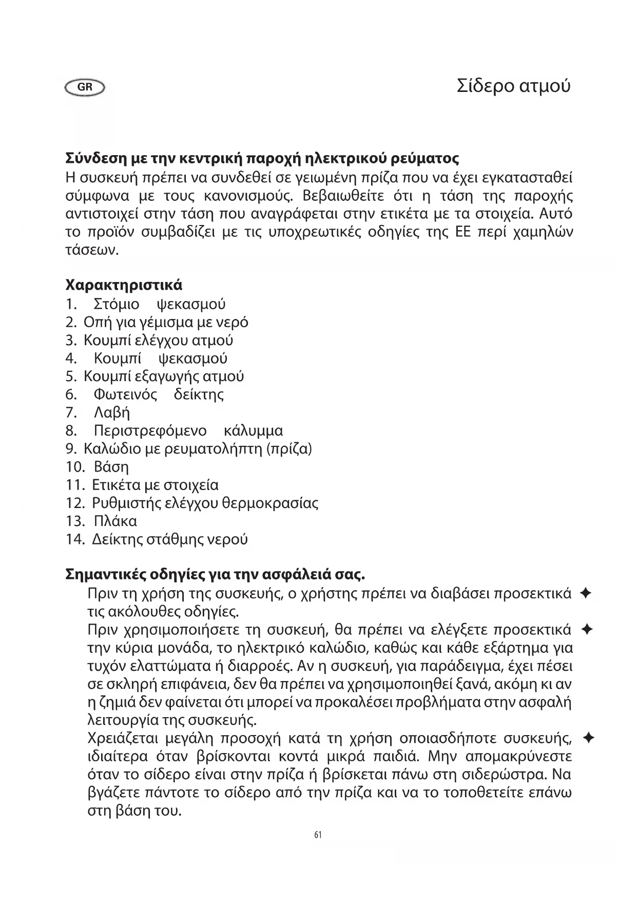 Σημαντικές οδηγίες για την ασφάλειά σας. Πριν τη χρήση της συσκευής, ο χρήστης πρέπει να διαβάσει προσεκτικά ✦ τις ακόλουθες οδηγίες. Πριν χρησιμοποιήσετε τη συσκευή, θα πρέπει να ελέγξετε προσεκτικά ✦ την κύρια μονάδα, το ηλεκτρικό καλώδιο, καθώς και κάθε εξάρτημα για τυχόν ελαττώματα ή διαρροές. Αν η συσκευή, για παράδειγμα, έχει πέσει σε σκληρή επιφάνεια, δεν θα πρέπει να χρησιμοποιηθεί ξανά, ακόμη κι αν η ζημιά δεν φαίνεται ότι μπορεί να προκαλέσει προβλήματα στην ασφαλή λειτουργία της συσκευής. Χρειάζεται μεγάλη προσοχή κατά τη χρήση οποιασδήποτε συσκευής, ✦ ιδιαίτερα όταν βρίσκονται κοντά μικρά παιδιά. Μην απομακρύνεστε όταν το σίδερο είναι στην πρίζα ή βρίσκεται πάνω στη σιδερώστρα. Να βγάζετε πάντοτε το σίδερο από την πρίζα και να το τοποθετείτε επάνω στη βάση του.