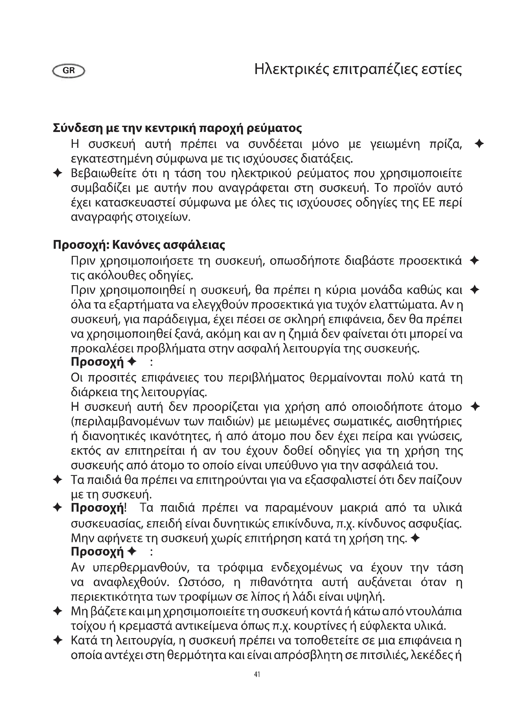 41καυτό ατμό. Να βεβαιώνεστε πάντα ότι τα πόδια στήριξης της συσκευής επιτρέπουν τη μέγιστη απόσταση από την επιφάνεια. Βγάζετε πάντοτε το καλώδιο από την πρίζα ✦ σε περίπτωση βλάβης, ✦ μετά τη χρήση, ✦ πριν καθαρίσετε τη συσκευή. ✦ Όταν βγάζετε το καλώδιο από την πρίζα, ποτέ μην το τραβάτε, φροντίζετε ✦ πάντα να πιάνετε σταθερά την πρίζα. Μην αφήνετε το καλώδιο να κρέμεται ελεύθερο. ✦ Να διατηρείτε πάντα το ηλεκτρικό καλώδιο αυτής της συσκευής ή ✦ οποιασδήποτε άλλης συσκευής μακριά από τα ζεστά μέρη της εστίας. Η συσκευή δεν προορίζεται για λειτουργία με εξωτερικό χρονοδιακόπτη ✦ ή ξεχωριστό τηλεχειριζόμενο σύστημα. Δεν αναλαμβάνουμε καμία ευθύνη για ζημιές που προκαλούνται λόγω ✦ λανθασμένης χρήσης ή επειδή δεν έχουν τηρηθεί οι οδηγίες. Η συσκευή αυτή προορίζεται για οικιακή και όχι για επαγγελματική ✦