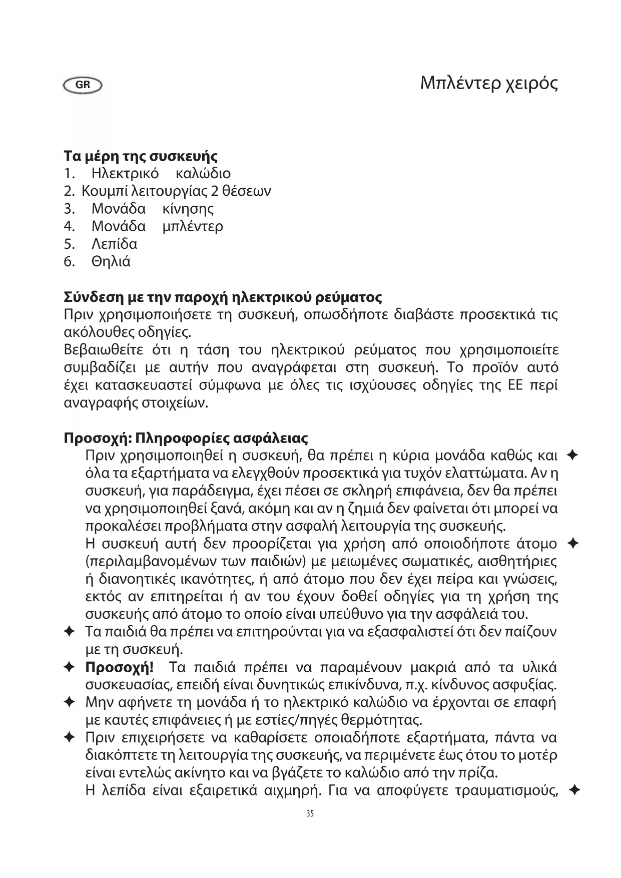 Σύνδεση με την παροχή ηλεκτρικού ρεύματος Πριν χρησιμοποιήσετε τη συσκευή, οπωσδήποτε διαβάστε προσεκτικά τις ακόλουθες οδηγίες. Βεβαιωθείτε ότι η τάση του ηλεκτρικού ρεύματος που χρησιμοποιείτε συμβαδίζει με αυτήν που αναγράφεται στη συσκευή. Το προϊόν αυτό έχει κατασκευαστεί σύμφωνα με όλες τις ισχύουσες οδηγίες της ΕΕ περί αναγραφής στοιχείων. Προσοχή: Πληροφορίες ασφάλειας Πριν χρησιμοποιηθεί η συσκευή, θα πρέπει η κύρια μονάδα καθώς και ✦ όλα τα εξαρτήματα να ελεγχθούν προσεκτικά για τυχόν ελαττώματα. Αν η συσκευή, για παράδειγμα, έχει πέσει σε σκληρή επιφάνεια, δεν θα πρέπει να χρησιμοποιηθεί ξανά, ακόμη και αν η ζημιά δεν φαίνεται ότι μπορεί να προκαλέσει προβλήματα στην ασφαλή λειτουργία της συσκευής. Η συσκευή αυτή δεν προορίζεται για χρήση από οποιοδήποτε άτομο ✦ (περιλαμβανομένων των παιδιών) με μειωμένες σωματικές, αισθητήριες ή διανοητικές ικανότητες, ή από άτομο που δεν έχει πείρα και γνώσεις, εκτός αν επιτηρείται ή αν του έχουν δοθεί οδηγίες για τη χρήση της συσκευής από άτομο το οποίο είναι υπεύθυνο για την ασφάλειά του. Τα παιδιά θα πρέπει να επιτηρούνται για να εξασφαλιστεί ότι δεν παίζουν ✦ με τη συσκευή. Προσοχή! ✦ Τα παιδιά πρέπει να παραμένουν μακριά από τα υλικά συσκευασίας, επειδή είναι δυνητικώς επικίνδυνα, π.χ. κίνδυνος ασφυξίας. Μην αφήνετε τη μονάδα ή το ηλεκτρικό καλώδιο να έρχονται σε επαφή ✦ με καυτές επιφάνειες ή με εστίες/πηγές θερμότητας. Πριν επιχειρήσετε να καθαρίσετε οποιαδήποτε εξαρτήματα, πάντα να ✦ διακόπτετε τη λειτουργία της συσκευής, να περιμένετε έως ότου το μοτέρ είναι εντελώς ακίνητο και να βγάζετε το καλώδιο από την πρίζα. Η λεπίδα είναι εξαιρετικά αιχμηρή. Για να αποφύγετε τραυματισμούς, ✦