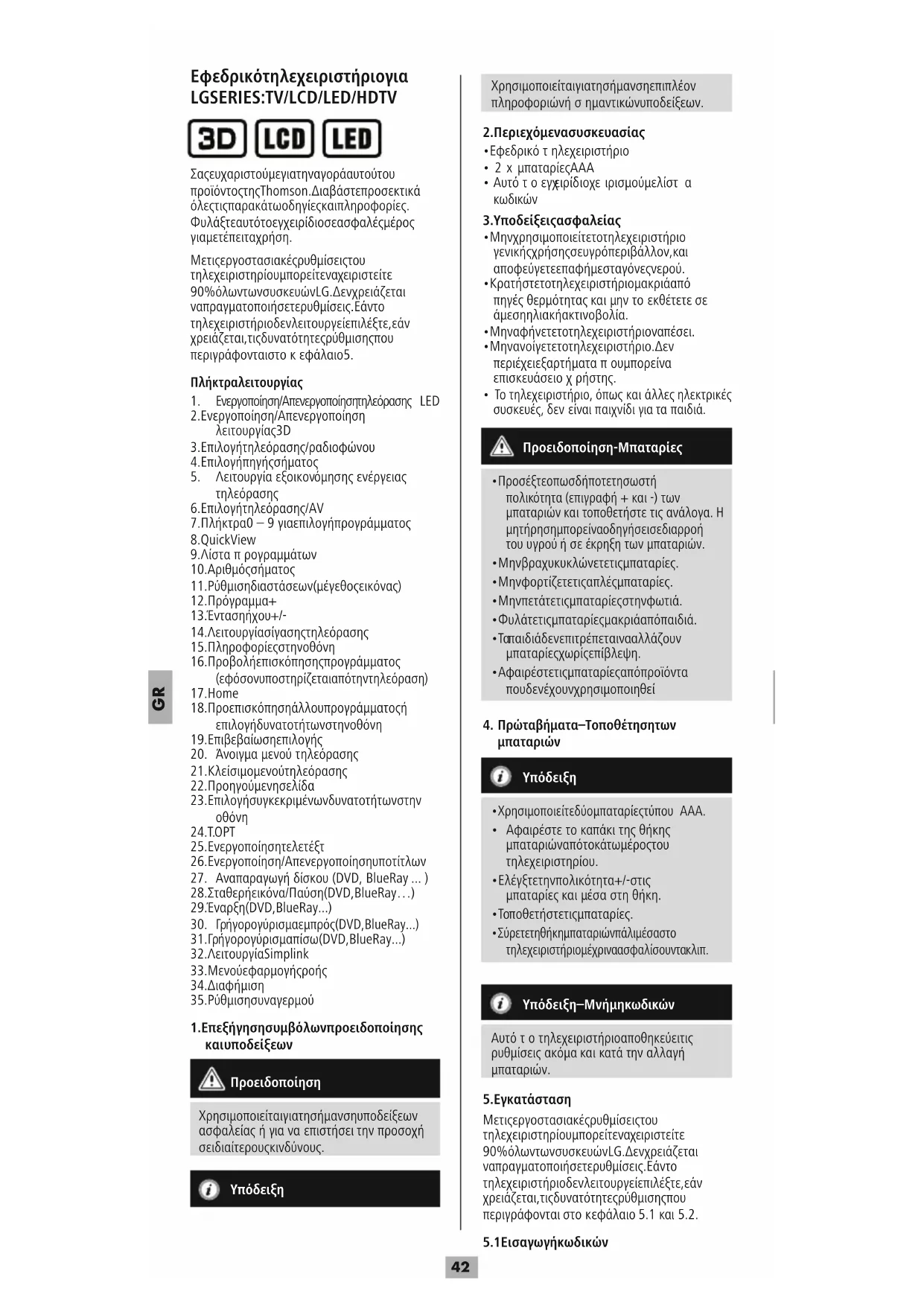 Σας ευχαριστούμε για την αγορά αυτού του προϊόντος της Thomson. Διαβάστε προσεκτικά όλες τις παρακάτω οδηγίες και πληροφορίες. Φυλάξτε αυτό το εγχειρίδιο σε ασφαλές μέρος για μετέπειτα χρήση. Με τις εργοστασιακές ρυθμίσεις του τηλεχειριστηρίου μπορείτε να χειριστείτε 90% όλων των συσκευών LG. Δεν χρειάζεται να πραγματοποιήσετε ρυθμίσεις. Εάν το τηλεχειριστήριο δεν λειτουργεί επιλέξτε, εάν χρειάζεται, τις δυνατότητες ρύθμισης που περιγράφονται στοκεφάλαιο 5. Πλήκτρα λειτουργίας