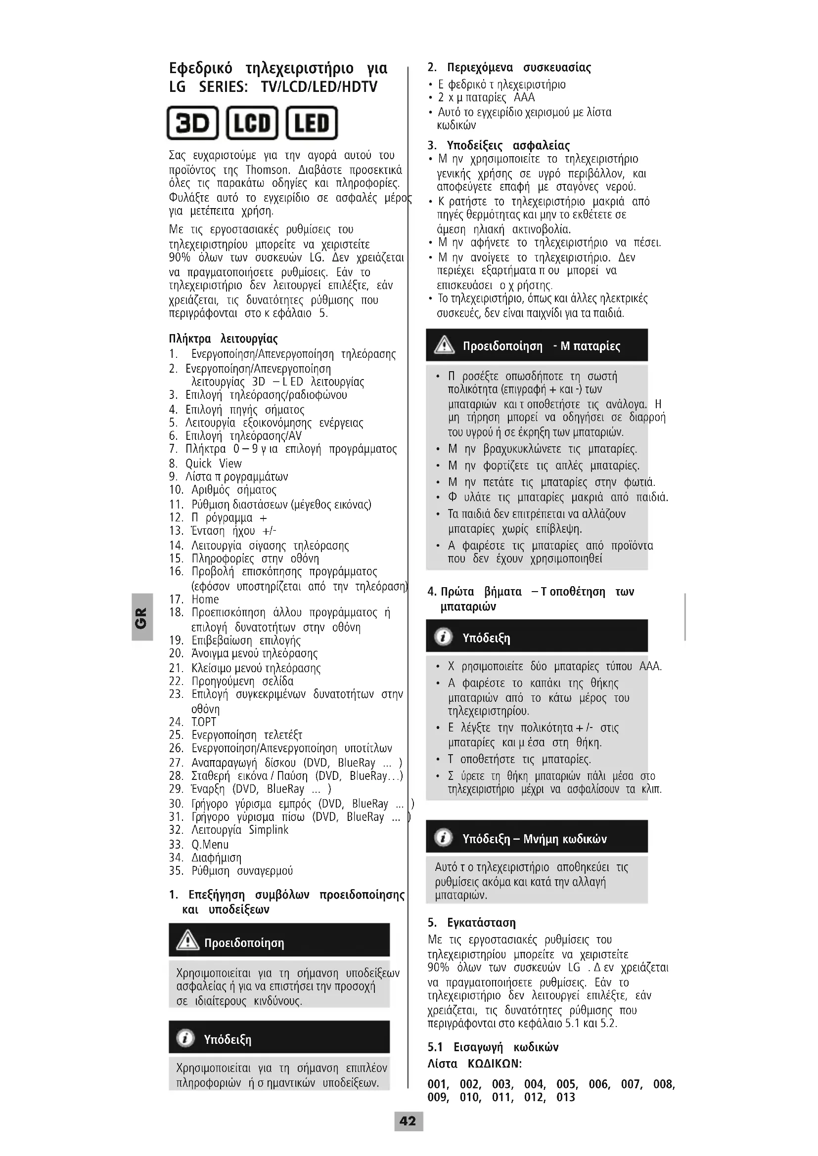 Σας ευχαριστούμε για την αγορά αυτού του προϊόντος της Thomson. Διαβάστε προσεκτικά όλες τις παρακάτω οδηγίες και πληροφορίες. Φυλάξτε αυτό το εγχειρίδιο σε ασφαλές μέρος για μετέπειτα χρήση. Με τις εργοστασιακές ρυθμίσεις του τηλεχειριστηρίου μπορείτε να χειριστείτε 90% όλων των συσκευών LG. Δεν χρειάζεται να πραγματοποιήσετε ρυθμίσεις. Εάν το τηλεχειριστήριο δεν λειτουργεί επιλέξτε, εάν χρειάζεται, τις δυνατότητες ρύθμισης που περιγράφονται στοκεφάλαιο 5. Πλήκτρα λειτουργίας