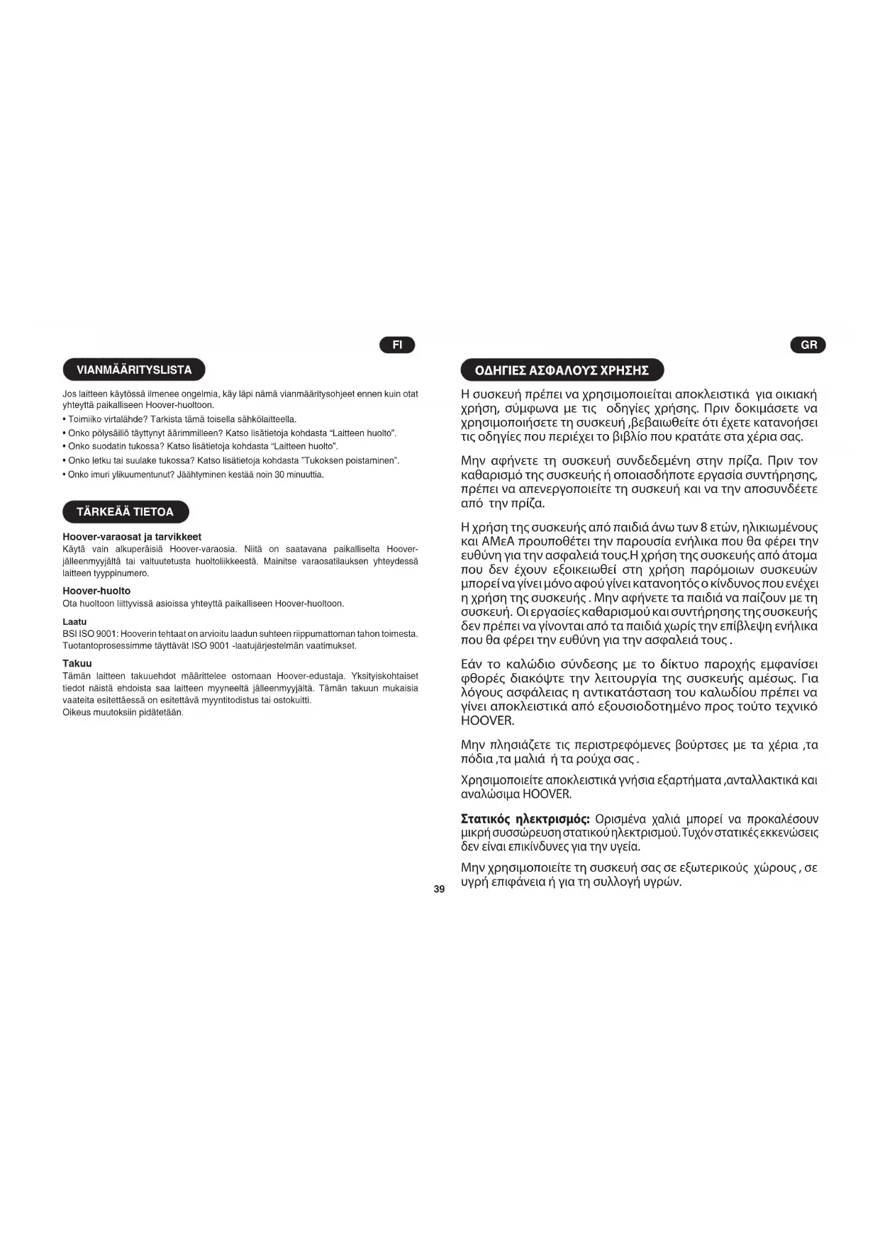- Onko imuri ylikuumentunut? Jäähtyminen kestää noin 30 minuuttia. ΟΔΗΓΙΕΣ ΑΣΦΑΛΟΥΣ ΧΡΗΣΗΣ H συσκευή πρέπει να χρησιμοποιείται αποκλειστικά για οικιακή χρήση, σύμφωνα με τις οδηγίες χρήσης. Πριν δοκιμάσετε να χρησιμοποιήσετε τη συσκευή ,βεβαιωθείτε ότι έχετε κατανοήσει τις οδηγίες που περιέχει το βιβλίο που κρατάτε στα χέρια σας. Μην αφήνετε τη συσκευή συνδεδεμένη στην πρίζα. Πριν τον καθαρισμό της συσκευής ή οποιασδήποτε εργασία συντήρησης, πρέπει να απενεργοποιείτε τη συσκευή και να την αποσυνδέετε από την πρίζα. Η χρήση της συσκευής από παιδιά άνω των 8 ετών, ηλικιωμένους και ΑΜεΑ προυποθέτει την παρουσία ενήλικα που θα φέρει την ευθύνη για την ασφαλειά τους.Η χρήση της συσκευής από άτομα που δεν έχουν εξοικειωθεί στη χρήση παρόμοιων συσκευών μπορεί να γίνει μόνο αφού γίνει κατανοητός ο κίνδυνος που ενέχει η χρήση της συσκευής . Μην αφήνετε τα παιδιά να παίζουν με τη συσκευή. Οι εργασίες καθαρισμού και συντήρησης της συσκευής δεν πρέπει να γίνονται από τα παιδιά χωρίς την επίβλεψη ενήλικα που θα φέρει την ευθύνη για την ασφαλειά τους . Εάν το καλώδιο σύνδεσης με το δίκτυο παροχής εμφανίσει φθορές διακόψτε την λειτουργία της συσκευής αμέσως. Για λόγους ασφάλειας η αντικατάσταση του καλωδίου πρέπει να γίνει αποκλειστικά από εξουσιοδοτημένο προς τούτο τεχνικό HOOVER. Μην πλησιάζετε τις περιστρεφόμενες βούρτσες με τα χέρια ,τα πόδια ,τα μαλιά ή τα ρούχα σας . Χρησιμοποιείτε αποκλειστικά γνήσια εξαρτήματα ,ανταλλακτικά και αναλώσιμα HOOVER. Στατικός ηλεκτρισμός: Ορισμένα χαλιά μπορεί να προκαλέσουν μικρή συσσώρευση στατικού ηλεκτρισμού. Τυχόν στατικές εκκενώσεις δεν είναι επικίνδυνες για την υγεία. Μην χρησιμοποιείτε τη συσκευή σας σε εξωτερικούς χώρους , σε υγρή επιφάνεια ή για τη συλλογή υγρών. GR40 Μην συλλέγετε με τη συσκευή σκληρά ή αιχμηρά αντικείμενα, καυτή στάχτη, αποτσίγαρα ή άλλα παρόμοια αντικείμενα. Μην ψεκάζετε ή συλλέγετε εύφλεκτα υγρά, υγρά καθαρισμού, αερολύματα ή τους ατμούς τους. Ενόσω χρησιμοποιείτε τη συσκευή δεν πρέπει να πατάτε επάνω στο καλώδιο ,μην τραβάτε το καλώδιο για να αποσυνδέσετε τη συσκευή από την παροχή. Εάν η συσκευή εμφανίσει κάποια βλάβη μην συνεχίσετε να την χρησιμοποιείτε. Τεχνική Υποστήριξη Hoover : Για την διατήρηση της ασφαλούς και αποτελεσματικής λειτουργίας της συσκευής οι επεμβάσεις συντήρισης και αποκατάστασης βλαβών πρέπει να γίνονται αποκλειστικά μέσω των εξουσιοδοτημένων τεχνικών HOOVER.. Μην στέκεστε πάνω στο καλώδιο και μην το περιτυλίγετε γύρω από τα χέρια ή τα πόδια σας ενόσω η συσκευή βρίσκεται σε λειτουργία. Μην χρησιμοποιείτε τη συσκευή για να καθαρίζετε ζώα ή άτομα. Μην τοποθετείτε πάνω σας τη συσκευή όταν καθαρίζετε τις