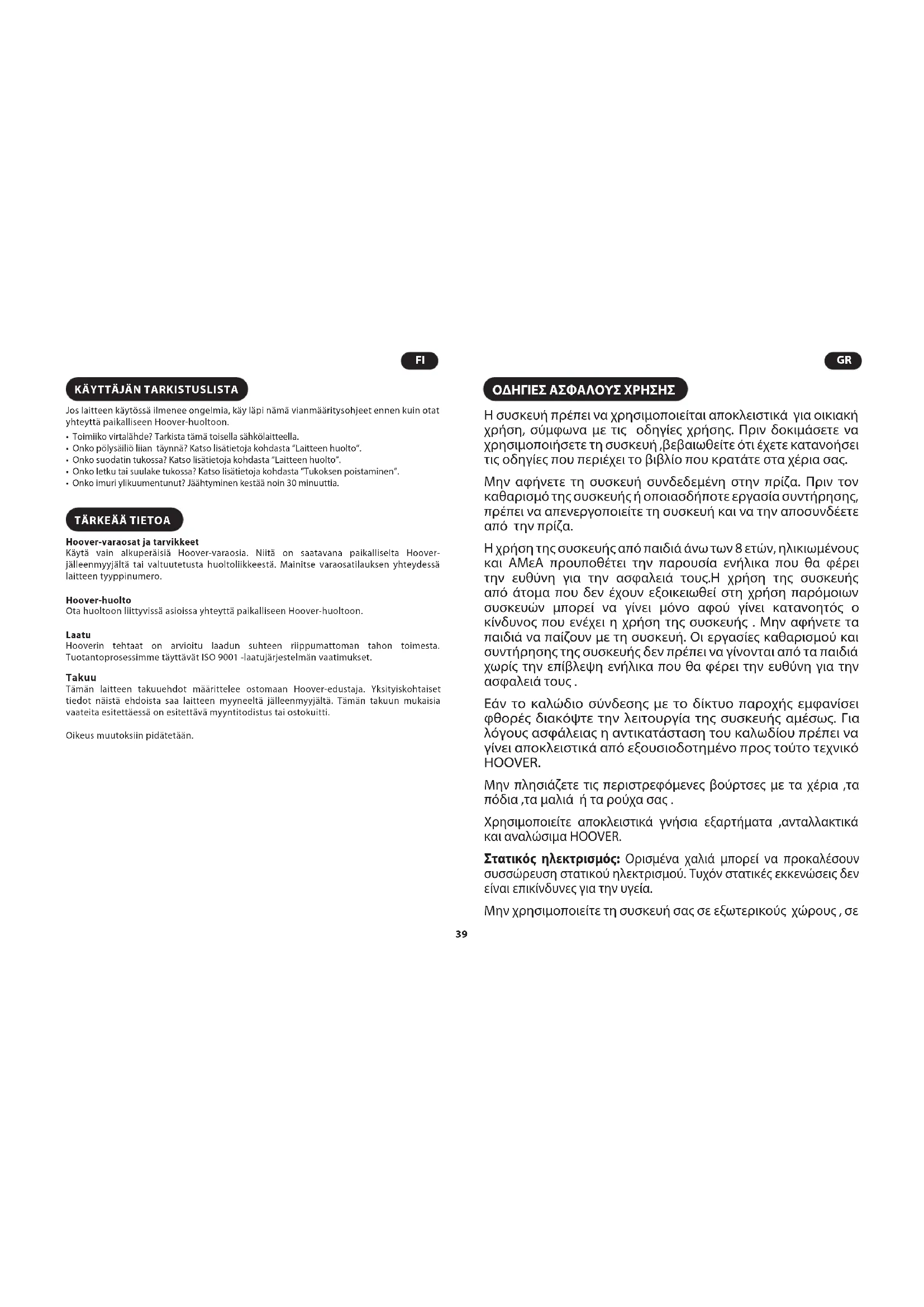 Miniturbosuulake eläintenkarvojen imurointiin* - Pienellä miniturbosuulakkeella voit imuroida portaita tai syväpuhdistaa tekstiilipintoja ja muita vaikeasti puhdistettavia paikkoja. Sopii erityisesti eläinten karvojen imurointiin. [W] Miniturbosuulake allergeenien poistoon* – Pienellä miniturbosuulakkeella voit imuroida portaita tai syväpuhdistaa tekstiilipintoja ja muita vaikeasti puhdistettavia paikkoja. Sopii erityisesti allergiaa aiheuttavien kohteiden imurointiin. [X] TÄRKEÄÄ: Älä käytä mini TurboSuulakkeita imuroidessasi pitkähapsullisia mattoja, eläinten taljoja tai mattoja, joiden nukan pituus on yli 15 mm. Älä pidä suulaketta paikoillaan yhdessä kohdassa harjan pyöriessä.ΟΔΗΓΙΕΣ ΑΣΦΑΛΟΥΣ ΧΡΗΣΗΣ H συσκευή πρέπει να χρησιμοποιείται αποκλειστικά για οικιακή χρήση, σύμφωνα με τις οδηγίες χρήσης. Πριν δοκιμάσετε να χρησιμοποιήσετε τη συσκευή ,βεβαιωθείτε ότι έχετε κατανοήσει τις οδηγίες που περιέχει το βιβλίο που κρατάτε στα χέρια σας. Μην αφήνετε τη συσκευή συνδεδεμένη στην πρίζα. Πριν τον καθαρισμό της συσκευής ή οποιασδήποτε εργασία συντήρησης, πρέπει να απενεργοποιείτε τη συσκευή και να την αποσυνδέετε από την πρίζα. Η χρήση της συσκευής από παιδιά άνω των 8 ετών, ηλικιωμένους και ΑΜεΑ προυποθέτει την παρουσία ενήλικα που θα φέρει την ευθύνη για την ασφαλειά τους.Η χρήση της συσκευής από άτομα που δεν έχουν εξοικειωθεί στη χρήση παρόμοιων συσκευών μπορεί να γίνει μόνο αφού γίνει κατανοητός ο κίνδυνος που ενέχει η χρήση της συσκευής . Μην αφήνετε τα παιδιά να παίζουν με τη συσκευή. Οι εργασίες καθαρισμού και συντήρησης της συσκευής δεν πρέπει να γίνονται από τα παιδιά χωρίς την επίβλεψη ενήλικα που θα φέρει την ευθύνη για την ασφαλειά τους . Εάν το καλώδιο σύνδεσης με το δίκτυο παροχής εμφανίσει φθορές διακόψτε την λειτουργία της συσκευής αμέσως. Για λόγους ασφάλειας η αντικατάσταση του καλωδίου πρέπει να γίνει αποκλειστικά από εξουσιοδοτημένο προς τούτο τεχνικό HOOVER. Μην πλησιάζετε τις περιστρεφόμενες βούρτσες με τα χέρια ,τα πόδια ,τα μαλιά ή τα ρούχα σας . Χρησιμοποιείτε αποκλειστικά γνήσια εξαρτήματα ,ανταλλακτικά και αναλώσιμα HOOVER. Στατικός ηλεκτρισμός: Ορισμένα χαλιά μπορεί να προκαλέσουν συσσώρευση στατικού ηλεκτρισμού. Τυχόν στατικές εκκενώσεις δεν είναι επικίνδυνες για την υγεία. Μην χρησιμοποιείτε τη συσκευή σας σε εξωτερικούς χώρους , σε