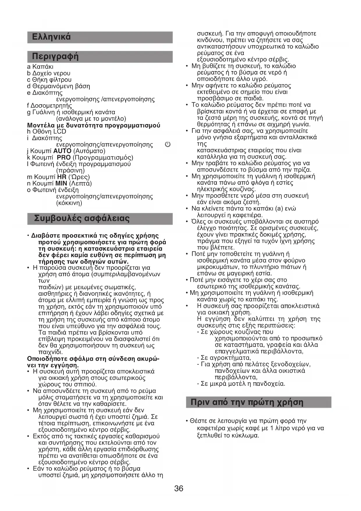 - Ξεπλύνετε την καφετιέρα θέτοντάς τη σε λει- τουργία 2 ή 3 φορές με 1 λίτρο νερό. Η εγγύηση δεν καλύπτει καφετιέρες, οι οποίες δεν λειτουργούν κανονικά ή καθόλου λόγω μη τήρησης της διαδικασίας αφαλάτωσης. Ισοθερμική κανάτα Γυάλινη κανάτα