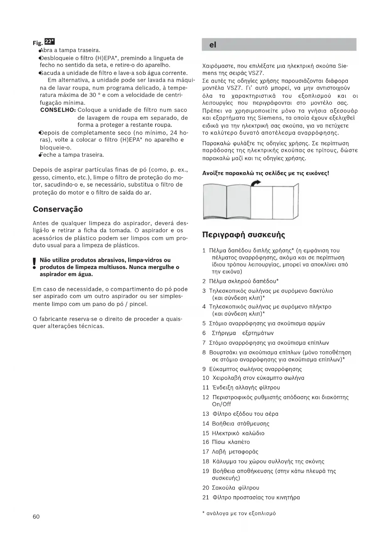 Χαιρόμαστε, που επιλέξατε μια ηλεκτρική σκούπα Sie- mens της σειράς VSZ7. Σε αυτές τις οδηγίες χρήσης παρουσιάζονται διάφορα μοντέλα VSZ7. Γι’ αυτό μπορεί, να μην αντιστοιχούν όλα τα χαρακτηριστικά του εξοπλισμού και οι λειτουργίες που περιγράφονται στο μοντέλο σας. Πρέπει να χρησιμοποιείτε μόνο τα γνήσια αξεσουάρ και εξαρτήματα της Siemens, τα οποία έχουν εξελιχθεί ειδικά για την ηλεκτρική σας σκούπα, για να πετύχετε το καλύτερο δυνατό αποτέλεσμα αναρρόφησης. Παρακαλώ φυλάξτε τις οδηγίες χρήσης. Σε περίπτωση παράδοσης της ηλεκτρικής σκούπας σε τρίτους, δώστε παρακαλώ μαζί και τις οδηγίες χρήσης. Ανοίξτε παρακαλώ τις σελίδες με τις εικόνες! Περιγραφή συσκευής 1 Πέλμα δαπέδου διπλής χρήσης* (η εμφάνιση του πέλματος αναρρόφησης, ακόμα και σε περίπτωση ίδιου τρόπου λειτουργίας, μπορεί να αποκλίνει από την εικόνα) 2 Πέλμα σκληρού δαπέδου* 3 Τηλεσκοπικός σωλήνας με συρόμενο δακτύλιο (και σύνδεση κλιπ)* 4 Τηλεσκοπικός σωλήνας με συρόμενο πλήκτρο (και σύνδεση κλιπ)* 5 Στόμιο αναρρόφησης για σκούπισμα αρμών 6 Στήριγμα εξρτημάτων 7 Στόμιο αναρρόφησης για σκούπισμα επίπλων 8 Βουρτσάκι για σκούπισμα επίπλων (μόνο τοποθέτηση σε στόμιο αναρρόφησης για σκούπισμα επίπλων)* 9 Εύκαμπτος σωλήνας αναρρόφησης 10 Χειρολαβή στον εύκαμπτο σωλήνα 11 Ένδειξη αλλαγής φίλτρου 12 Περιστροφικός ρυθμιστής απόδοσης και διακόπτης On/Off 13 Φίλτρο εξόδου του αέρα 14 Βοήθεια στάθμευσης 15 Ηλεκτρικό καλώδιο 16 Πίσω κλαπέτο 17 Λαβή μεταφοράς 18 Κάλυμμα του χώρου συλλογής της σκόνης 19 Βοήθεια αποθήκευσης (στην κάτω πλευρά της