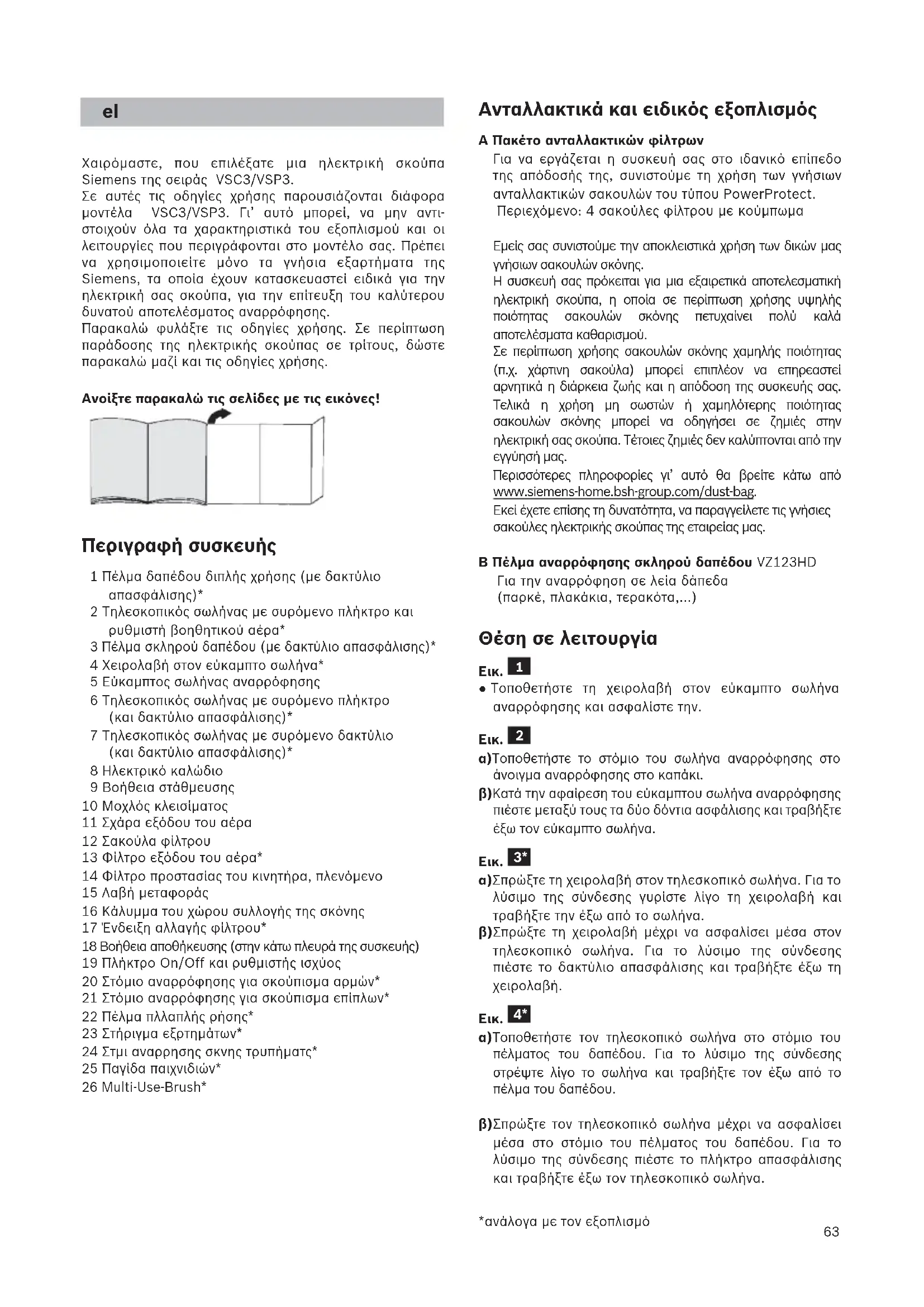 Χαιρόµαστε, που επιλέξατε µια ηλεκτρική σκούπα Siemens της σειράς VSC3/VSP3. Σε αυτές τις οδηγίες χρήσης παρουσιάζονται διάφορα µοντέλα VSC3/VSP3. Γι’ αυτό µπορεί, να µην αντι- στοιχούν όλα τα χαρακτηριστικά του εξοπλισµού και οι λειτουργίες που περιγράφονται στο µοντέλο σας. Πρέπει να χρησιµοποιείτε µόνο τα γνήσια εξαρτήµατα της Siemens, τα οποία έχουν κατασκευαστεί ειδικά για την ηλεκτρική σας σκούπα, για την επίτευξη του καλύτερου δυνατού αποτελέσµατος αναρρόφησης. Παρακαλώ φυλάξτε τις οδηγίες χρήσης. Σε περίπτωση παράδοσης της ηλεκτρικής σκούπας σε τρίτους, δώστε παρακαλώ µαζί και τις οδηγίες χρήσης. Ανοίξτε παρακαλώ τις σελίδες με τις εικόνες! Περιγραφή συσκευής 1 Πέλμα δαπέδου διπλής χρήσης (με δακτύλιο απασφάλισης)* 2 Τηλεσκοπικός σωλήνας με συρόμενο πλήκτρο και ρυθμιστή βοηθητικού αέρα* 3 Πέλμα σκληρού δαπέδου (με δακτύλιο απασφάλισης)* 4 Χειρολαβή στον εύκαμπτο σωλήνα* 5 Εύκαμπτος σωλήνας αναρρόφησης 6 Τηλεσκοπικός σωλήνας με συρόμενο πλήκτρο (και δακτύλιο απασφάλισης)* 7 Τηλεσκοπικός σωλήνας με συρόμενο δακτύλιο (και δακτύλιο απασφάλισης)* 8 Ηλεκτρικό καλώδιο 9 Βοήθεια στάθμευσης 10 Μοχλός κλεισίματος 11 Σχάρα εξόδου του αέρα 12 Σακούλα φίλτρου 13 Φίλτρο εξόδου του αέρα* 14 Φίλτρο προστασίας του κινητήρα, πλενόμενο 15 Λαβή μεταφοράς 16 Κάλυμμα του χώρου συλλογής της σκόνης 17 Ένδειξη αλλαγής φίλτρου* 18 Βοήθεια αποθήκευσης (στην κάτω πλευρά της συσκευής) 19 Πλήκτρο On/Off και ρυθμιστής ισχύος 20 Στόμιο αναρρόφησης για σκούπισμα αρμών* 21 Στόμιο αναρρόφησης για σκούπισμα επίπλων* 22 Πέλμα πλλαπλής ρήσης* 23 Στήριγμα εξρτημάτων* 24 Στμι αναρρησης σκνης τρυπήματς* 25 Παγίδα παιχνιδιών* 26 Multi-Use-Brush*