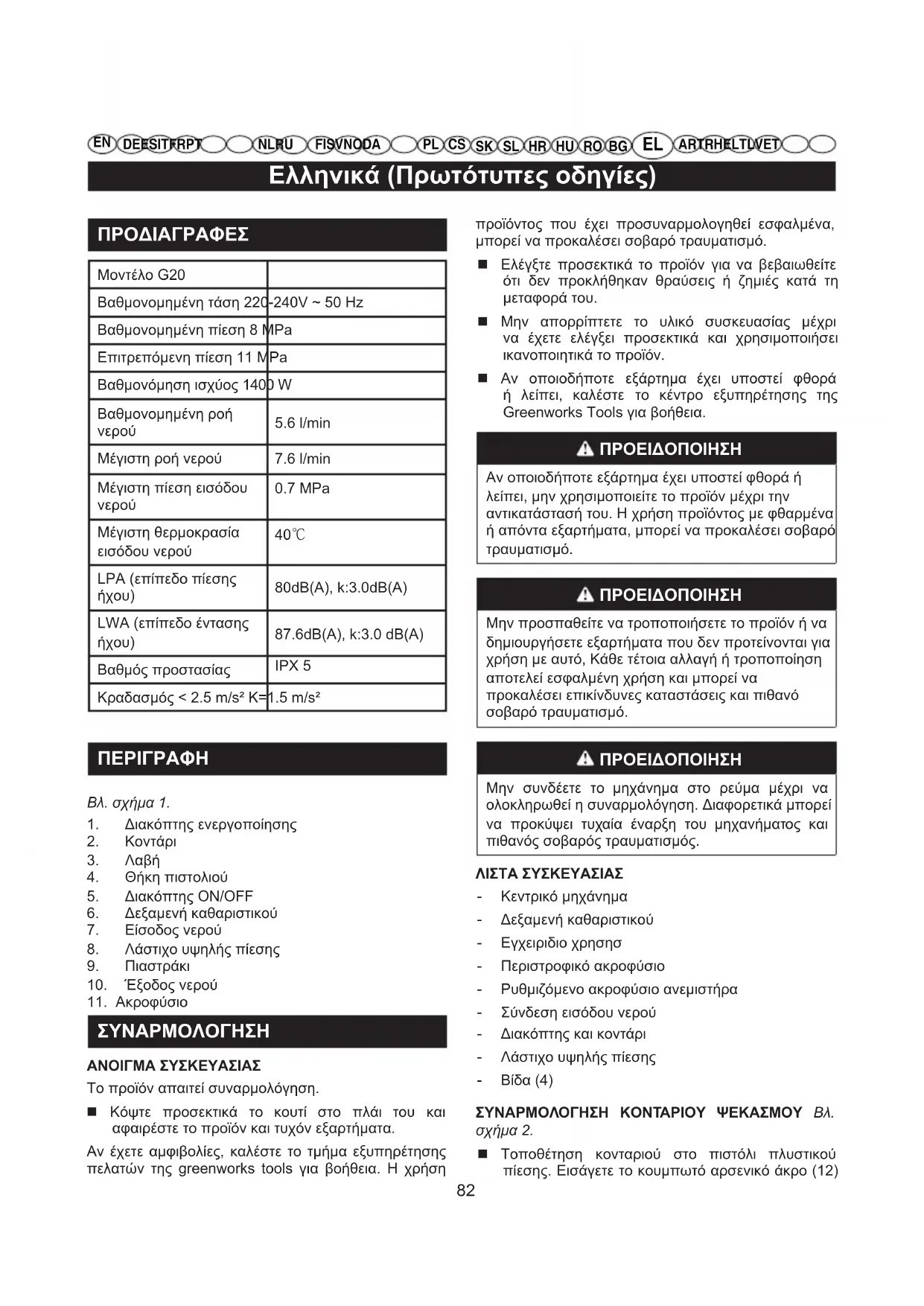 Κατεβάστε τις οδηγίες για το υψηλής πίεσης καθαριστής σε μορφή PDF δωρεάν! Βρείτε το εγχειρίδιό σας G20 - GREENWORKS και πάρτε ξανά την ηλεκτρονική σας συσκευή στα χέρια σας. Σε αυτή τη σελίδα δημοσιεύονται όλα τα έγγραφα που απαιτούνται για τη χρήση της συσκευής σας. G20 της μάρκας GREENWORKS.