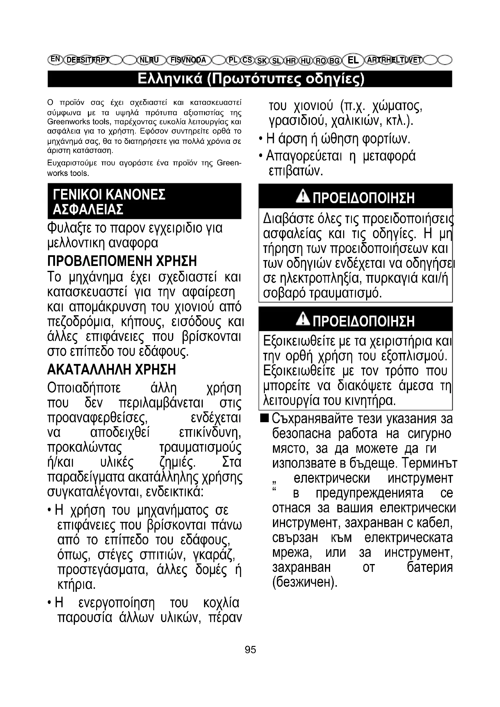 ΠΡΟΕΙΔΟΠΟΙΗΣΗ Διαβάστε όλες τις προειδοποιήσεις ασφαλείας και τις οδηγίες. Η μη τήρηση των προειδοποιήσεων και των οδηγιών ενδέχεται να οδηγήσει σε ηλεκτροπληξία, πυρκαγιά και/ή σοβαρό τραυματισμό. ΠΡΟΕΙΔΟΠΟΙΗΣΗ Εξοικειωθείτε με τα χειριστήρια και την ορθή χρήση του εξοπλισμού. Εξοικειωθείτε με τον τρόπο που μπορείτε να διακόψετε άμεσα τη λειτουργία του κινητήρα. Съхранявайте тези указания за безопасна работа на сигурно място, за да можете да ги използвате в бъдеще. Терминът „ електрически инструмент “ в предупрежденията се отнася за вашия електрически инструмент, захранван с кабел, свързан към електрическата мрежа, или за инструмент, захранван от батерия (безжичен). Ο προϊόν σας έχει σχεδιαστεί και κατασκευαστεί σύμφωνα με τα υψηλά πρότυπα αξιοπιστίας της Greenworks tools, παρέχοντας ευκολία λειτουργίας και ασφάλεια για το χρήστη. Εφόσον συντηρείτε ορθά το μηχάνημά σας, θα το διατηρήσετε για πολλά χρόνια σε άριστη κατάσταση. Ευχαριστούμε που αγοράστε ένα προϊόν της Green- works tools. ΓΕΝΙΚΟΙ ΚΑΝΟΝΕΣ