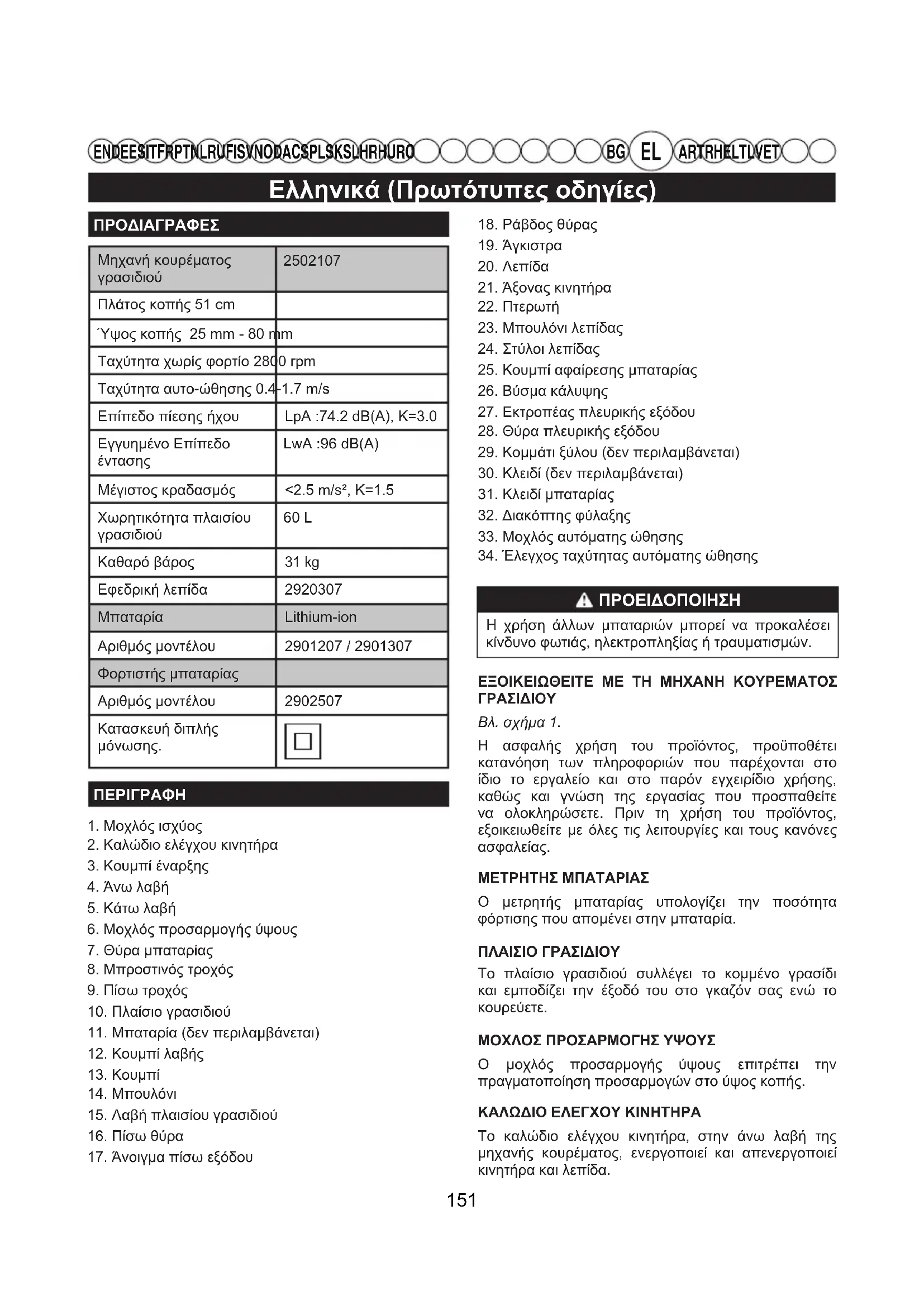 AR TR HE LT LV ET ΠΡΟΔΙΑΓΡΑΦΕΣΜηχανή κουρέματος γρασιδιού2502107Πλάτος κοπής 51 cmΎψος κοπής 25 mm - 80 mmΤαχύτητα χωρίς φορτίο 2800 rpmΤαχύτητα αυτο-ώθησης 0.4-1.7 m/sΕπίπεδο πίεσης ήχου LpA :74.2 dB(A), K=3.0Εγγυημένο Επίπεδο έντασηςLwA :96 dB(A)Μέγιστος κραδασμός <2.5 m/s², K=1.5Χωρητικότητα πλαισίου γρασιδιού 60 L Καθαρό βάρος 31 kgΕφεδρική λεπίδα 2920307Μπαταρία Lithium-ionΑριθμός μοντέλου 2901207 / 2901307Φορτιστής μπαταρίαςΑριθμός μοντέλου 2902507Κατασκευή διπλής μόνωσης.ΠΕΡΙΓΡΑΦΗ1. Μοχλός ισχύος2. Καλώδιο ελέγχου κινητήρα3. Κουμπί έναρξης4. Άνω λαβή5. Κάτω λαβή6. Μοχλός προσαρμογής ύψους7. Θύρα μπαταρίας8. Μπροστινός τροχός9. Πίσω τροχός10. Πλαίσιο γρασιδιού11. Μπαταρία (δεν περιλαμβάνεται)12. Κουμπί λαβής13. Κουμπί14. Μπουλόνι15. Λαβή πλαισίου γρασιδιού16. Πίσω θύρα17. Άνοιγμα πίσω εξόδου18. Ράβδος θύρας19. Άγκιστρα20. Λεπίδα21. Άξονας κινητήρα22. Πτερωτή23. Μπουλόνι λεπίδας24. Στύλοι λεπίδας25. Κουμπί αφαίρεσης μπαταρίας26. Βύσμα κάλυψης27. Εκτροπέας πλευρικής εξόδου28. Θύρα πλευρικής εξόδου29. Κομμάτι ξύλου (δεν περιλαμβάνεται)30. Κλειδί (δεν περιλαμβάνεται)31. Κλειδί μπαταρίας32. Διακόπτης φύλαξης33. Μοχλός αυτόματης ώθησης 34. Έλεγχος ταχύτητας αυτόματης ώθησης ΠΡΟΕΙΔΟΠΟΙΗΣΗ Η χρήση άλλων μπαταριών μπορεί να προκαλέσει κίνδυνο φωτιάς, ηλεκτροπληξίας ή τραυματισμών. ΕΞΟΙΚΕΙΩΘΕΙΤΕ ΜΕ ΤΗ ΜΗΧΑΝΗ ΚΟΥΡΕΜΑΤΟΣ ΓΡΑΣΙΔΙΟΥΒλ. σχήμα 1. Η ασφαλής χρήση του προϊόντος, προϋποθέτει κατανόηση των πληροφοριών που παρέχονται στο ίδιο το εργαλείο και στο παρόν εγχειρίδιο χρήσης, καθώς και γνώση της εργασίας που προσπαθείτε να ολοκληρώσετε. Πριν τη χρήση του προϊόντος, εξοικειωθείτε με όλες τις λειτουργίες και τους κανόνες ασφαλείας.ΜΕΤΡΗΤΗΣ ΜΠΑΤΑΡΙΑΣ Ο μετρητής μπαταρίας υπολογίζει την ποσότητα φόρτισης που απομένει στην μπαταρία.ΠΛΑΙΣΙΟ ΓΡΑΣΙΔΙΟΥ Το πλαίσιο γρασιδιού συλλέγει το κομμένο γρασίδι και εμποδίζει την έξοδό του στο γκαζόν σας ενώ το κουρεύετε.ΜΟΧΛΟΣ ΠΡΟΣΑΡΜΟΓΗΣ ΥΨΟΥΣ Ο μοχλός προσαρμογής ύψους επιτρέπει την πραγματοποίηση προσαρμογών στο ύψος κοπής.ΚΑΛΩΔΙΟ ΕΛΕΓΧΟΥ ΚΙΝΗΤΗΡΑ Το καλώδιο ελέγχου κινητήρα, στην άνω λαβή της μηχανής κουρέματος, ενεργοποιεί και απενεργοποιεί κινητήρα και λεπίδα. 151Ελληνικά (Πρωτότυπες οδηγίες)