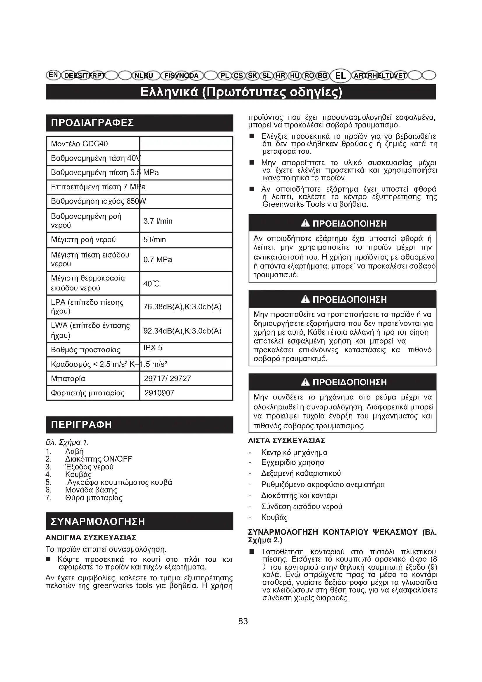 ΣΥΝΑΡΜΟΛΟΓΗΣΗ ΑΝΟΙΓΜΑ ΣΥΣΚΕΥΑΣΙΑΣ Το προϊόν απαιτεί συναρμολόγηση. Κόψτε προσεκτικά το κουτί στο πλάι του και αφαιρέστε το προϊόν και τυχόν εξαρτήματα. Αν έχετε αμφιβολίες, καλέστε το τμήμα εξυπηρέτησης πελατών της greenworks tools για βοήθεια. Η χρήση προϊόντος που έχει προσυναρμολογηθεί εσφαλμένα, μπορεί να προκαλέσει σοβαρό τραυματισμό. Ελέγξτε προσεκτικά το προϊόν για να βεβαιωθείτε ότι δεν προκλήθηκαν θραύσεις ή ζημιές κατά τη μεταφορά του. Μην απορρίπτετε το υλικό συσκευασίας μέχρι να έχετε ελέγξει προσεκτικά και χρησιμοποιήσει ικανοποιητικά το προϊόν. Αν οποιοδήποτε εξάρτημα έχει υποστεί φθορά ή λείπει, καλέστε το κέντρο εξυπηρέτησης της Greenworks Tools για βοήθεια. ΠΡΟΕΙΔΟΠΟΙΗΣΗ Αν οποιοδήποτε εξάρτημα έχει υποστεί φθορά ή λείπει, μην χρησιμοποιείτε το προϊόν μέχρι την αντικατάστασή του. Η χρήση προϊόντος με φθαρμένα ή απόντα εξαρτήματα, μπορεί να προκαλέσει σοβαρό τραυματισμό. ΠΡΟΕΙΔΟΠΟΙΗΣΗ Μην προσπαθείτε να τροποποιήσετε το προϊόν ή να δημιουργήσετε εξαρτήματα που δεν προτείνονται για χρήση με αυτό, Κάθε τέτοια αλλαγή ή τροποποίηση αποτελεί εσφαλμένη χρήση και μπορεί να προκαλέσει επικίνδυνες καταστάσεις και πιθανό σοβαρό τραυματισμό. ΠΡΟΕΙΔΟΠΟΙΗΣΗ Μην συνδέετε το μηχάνημα στο ρεύμα μέχρι να ολοκληρωθεί η συναρμολόγηση. Διαφορετικά μπορεί να προκύψει τυχαία έναρξη του μηχανήματος και πιθανός σοβαρός τραυματισμός. ΛΙΣΤΑ ΣΥΣΚΕΥΑΣΙΑΣ - Κεντρικό μηχάνημα - Εγχειριδιο χρησησ - Δεξαμενή καθαριστικού - Ρυθμιζόμενο ακροφύσιο ανεμιστήρα - Διακόπτης και κοντάρι - Σύνδεση εισόδου νερού