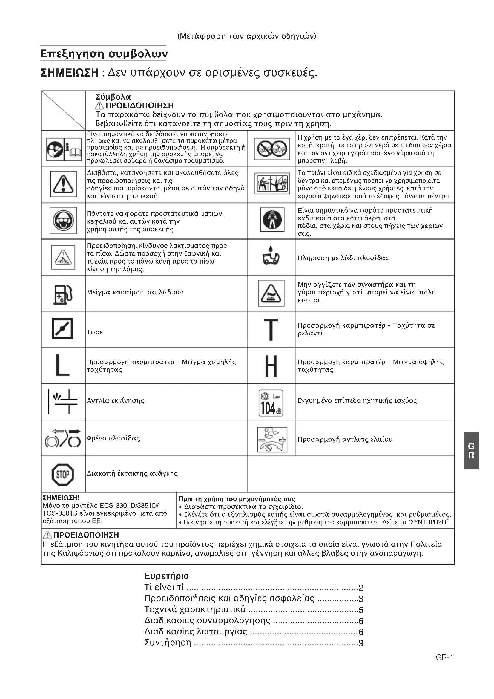 ΠΡΟΕΙΔΟΠΟΙΗΣΗ Τα παρακάτω δείχνουν τα σύμβολα που χρησιμοποιούνται στο μηχάνημα. Βεβαιωθείτε ότι κατανοείτε τη σημασίας τους πριν τη χρήση. ÊÂáÔÕÆÌÂÕÂÏÐ½ÔÆÕÆÌÂÊÂÌÐÍÐÚÖ½ÔÆÕÆ¿ÍÆØÕÊØÑÓÐÆÊÅÐÑÐÊ½ÔÆÊØÌÂÊÕÊØÐÅÉÈ¾ÆØÑÐÚEÓ¾ÔÌÐÏÕÂÊμÔÂÔÆÂÚÕ¿ÏÕÐÏÐÅÉÈ¿ÌÂÊÑ¡Ï×ÔÕÉÔÚÔÌÆÚ½¾ÏÂÊÔÉÎÂÏÕÊÌ¿ÏÂÅÊÂÃ¡ÔÆÕÆÏÂÌÂÕÂÏÐ½ÔÆÕÆÑͽÓרÌÂÊÏÂÂÌÐÍÐÚÖ½ÔÆÕÆÕÂÑÂÓÂÌ¡Õ×μÕÓÂÑÓÐÔÕÂÔ¾ÂØÌÂÊÕÊØÑÓÐÆÊÅÐÑÐÊ½ÔÆÊØÂÑÓ¿ÔÆÌÕɽÉÂÌÂÕ¡ÍÍÉÍÉÙÓ½ÔÉÕÉØÔÚÔÌÆÚ½ØÎÑÐÓÆ¾ÏÂÑÓÐÌÂÍ¼ÔÆÊÔÐÃÂÓ¿½ÖÂÏ¡ÔÊÎÐÕÓÂÚÎÂÕÊÔο¡ÏÕÐÕÆÏÂÇÐÓ¡ÕÆÑÓÐÔÕÂÕÆÚÕÊÌ¡ÎÂÕÊÒÏÌÆÇÂÍÊÐÁÌÂÊÂÚÕÒÏÌÂÕ¡ÕÉÏÙÓ½ÔÉÂÚÕ½ØÕÉØÔÚÔÌÆÚ½ØΜείγμα καυσίμου και λαδιών Φρένο αλυσίδαςΔιακοπή έκτακτης ανάγκηςΠροσαρμογή καρμπιρατέρ – Μείγμα χαμηλήςταχύτηταςΑντλία εκκίνησηςΜην αγγίζετε τον σιγαστήρα και τηγύρω περιοχή γιατί μπορεί να είναι πολύκαυτοί.Πλήρωση με λάδι αλυσίδαςΠροσαρμογή καρμπιρατέρ – Ταχύτητα σε ρελαντίΠροσαρμογή καρμπιρατέρ – Μείγμα υψηλήςταχύτηταςΕγγυημένο επίπεδο ηχητικής ισχύοςΠροσαρμογή αντλίας ελαίου¿ÏÐÕÐÎÐÏÕ¼ÍÐ(&6''7&66ƾÏÂÊÆÈÌÆÌÓÊμÏÐÎÆÕ¡ÂÑ¿ÆË¼ÕÂÔÉÕÁÑÐÚÓÊÏÕÉÙÓ½ÔÉÕÐÚÎÉÙÂϽÎÂÕ¿ØÔÂØ• Διαβάστε προσεκτικά το εγχειρίδιο.• Ελέγξτε ότι ο εξοπλισμός κοπής είναι σωστά συναρμολογημένος και ρυθμισμένος.• Εκκινήστε τη συσκευή και ελέγξτε την ρύθμιση του καρμπυρατέρ. Δείτε το “ΣΥΝΤΗΡΗΣΗ”.