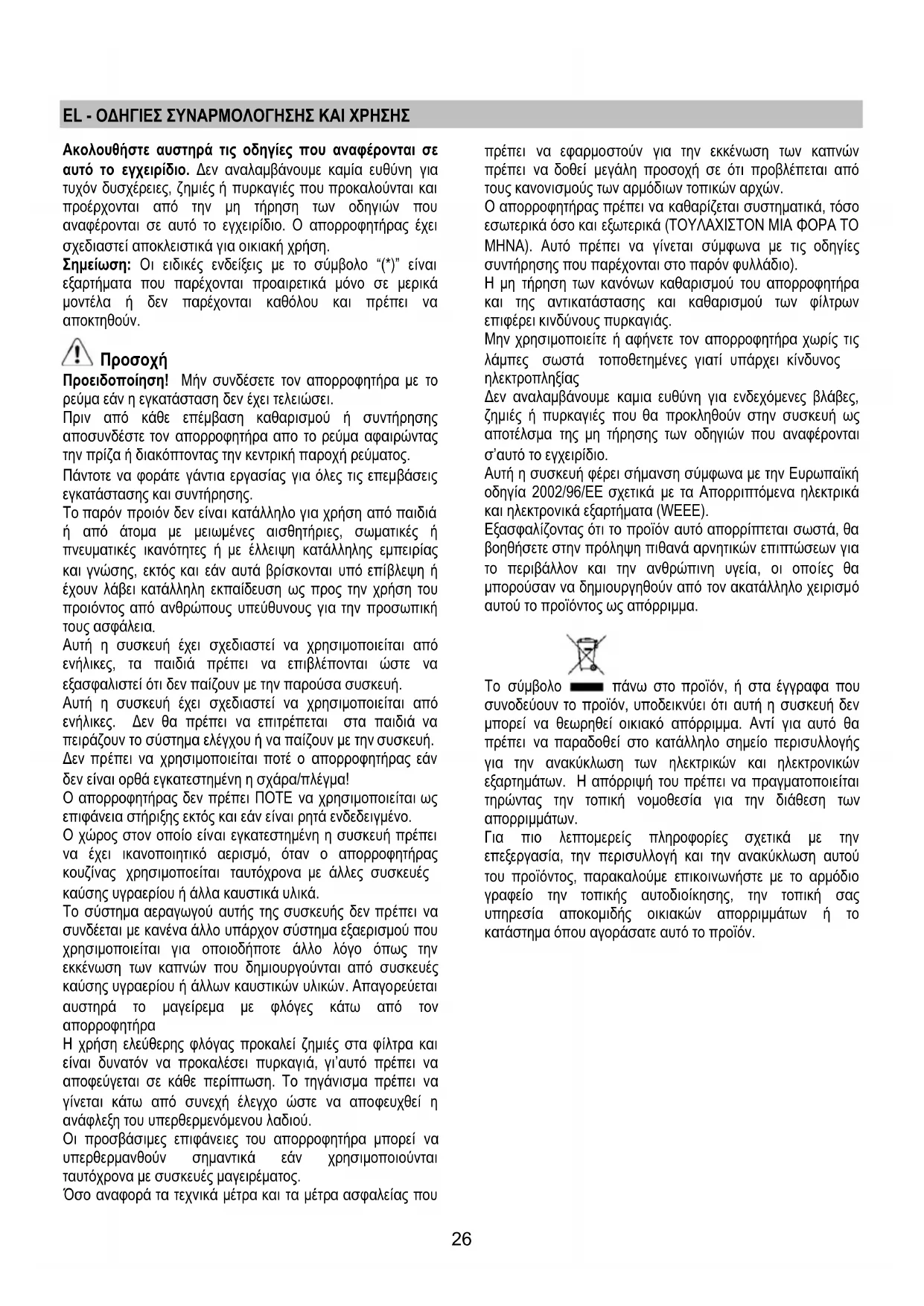 όσο και εξωτερικά (ΤΟΥΛΑΧΙΣΤΟΝ ΜΙΑ ΦΟΡΑ ΤΟ ΜΗΝΑ). Αυτό πρέπει να γίνεται σύμφωνα με τις οδηγίες συντήρησης που παρέχονται στο παρόν φυλλάδιο). Η μη τήρηση των κανόνων καθαρισμού του απορροφητήρα και της αντικατάστασης και καθαρισμού των φίλτρων επιφέρει κινδύνους πυρκαγιάς. Μην χρησιμοποιείτε ή αφήνετε τον απορροφητήρα χωρίς τις λάμπες σωστά τοποθετημένες γιατί υπάρχει κίνδυνος ηλεκτροπληξίας Δεν αναλαμβάνουμε καμια ευθύνη για ενδεχόμενες βλάβες, ζημιές ή πυρκαγιές που θα προκληθούν στην συσκευή ως αποτέλσμα της μη τήρησης των οδηγιών που αναφέρονται σ’αυτό το εγχειρίδιο. Αυτή η συσκευή φέρει σήμανση σύμφωνα με την Ευρωπαϊκή οδηγία 2002/96/ΕΕ σχετικά με τα Απορριπτόμενα ηλεκτρικά και ηλεκτρονικά εξαρτήματα (WEEE). Εξασφαλίζοντας ότι το προϊόν αυτό απορρίπτεται σωστά, θα βοηθήσετε στην πρόληψη πιθανά αρνητικών επιπτώσεων για το περιβάλλον και την ανθρώπινη υγεία, οι οποίες θα μπορούσαν να δημιουργηθούν από τον ακατάλληλο χειρισμό αυτού το προϊόντος ως απόρριμμα.