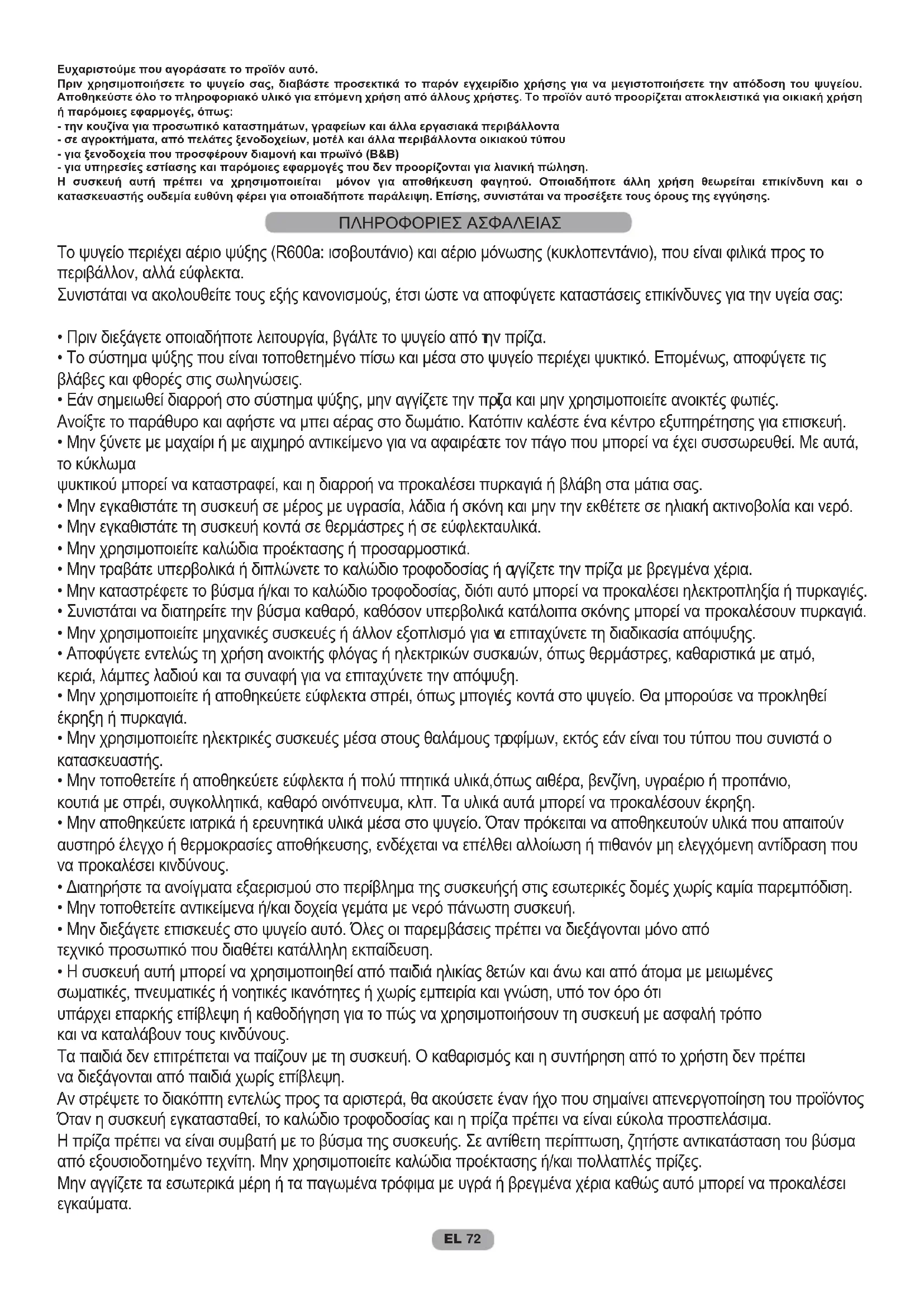 - Vergewis u ervan dat er stroom is in de woning. ALS U HET PROBLEEM NIET HEBT OPGELOST, NEEM CONTACT OP MET HET SERVICECENTRUM. VERMELD DE AARD VAN DE STORING EN DE INFORMATIE OP HET TYPEPLAATJE BINNENIN HET KOELGEDEELTE:EL ΠΕΡΙΕΧΟΜΕΝΑ EL 71 ΠΛΗΡΟΦΟΡΙΕΣ ΑΣΦΑΛΕΙΑΣ .............................................. 72--72 ΕΓΚΑΤΑΣΤΑΣΗ .................................................................... 73--73 ΛΕΙΤΟΥΡΓΙΑ .......................................................................... 73--73 ΔΙΑΤΗΡΗΣΗ .......................................................................... 74--74 ΚΑΤΑΨΥΞΗ .......................................................................... 75--75 ΑΠΟΨΥΞΗ ............................................................................ 75--75 ΣΥΝΤΗΡΗΣΗ ΚΑΙ ΚΑΘΑΡΙΣΜΟΣ ........................................ 76--76 ΕΞΟΙΚΟΝΟΜΗΣΗ ΕΝΕΡΓΕΙΑΣ ............................................ 76--76 ΑΘΟΡΥΒΗ ΛΕΙΤΟΥΡΓΙΑ ...................................................... 76--76 ΑΝΤΙΣΤΡΟΦΗ ΤΗΣ ΠΟΡΤΑΣ ................................................ 76--77 ΔΙΑΣΤΑΣΕΙΣ ΠΡΟΪΟΝΤΟΣ ΚΑΙ ΕΝΣΩΜΑΤΩΜΕΝΟΣ ΘΑΛΑΜΟΣ ............................................................................ 77--78 ΤΟΠΟΘΕΤΗΣΗ ΤΗΣ ΣΥΣΚΕΥΗΣ ΣΤΗ ΣΤΗΛΗ ΕΓΚΑ ΤΑΣΤΑΣΗΣ ............................................................................ 78--78 ΕΝΩΣΗ ΤΩΝ ΘΥΡΩΝ ΤΟΥ ΨΥΓΕΙΟΥ ΜΕ ΤΙΣ ΠΟΡΤΕΣ ΤΟΥ ΕΠΙΠΛΟΥ ................................................ 79--79 ΠΡΟΦΥΛΑΞΕΙΣ ΓΙΑ ΤΗ ΣΩΣΤΗ ΛΕΙΤΟΥΡΓΙΑ...................... 79--79 ΠΑΡΑΤΕΤΑΜΕΝΗ ΑΝΑΣΤΟΛΗ ΛΕΙΤΟΥΡΓΙΑΣ.................... 79--79 ΑΝΤΙΜΕΤΩΠΙΣΗ ΠΡΟΒΛΗΜΑΤΩΝ ...................................... 80--80EL 72 Ευχαριστούμε που αγοράσατε το προϊόν αυτό. Πριν χρησιμοποιήσετε το ψυγείο σας, διαβάστε προσεκτικά το παρόν εγχειρίδιο χρήσης για να μεγιστοποιήσετε την απόδοση του ψυγείου. Αποθηκεύστε όλο το πληροφοριακό υλικό για επόμενη χρήση από άλλους χρήστες. Το προϊόν αυτό προορίζεται αποκλειστικά για οικιακή χρήση ή παρόμοιες εφαρμογές, όπως: - την κουζίνα για προσωπικό καταστημάτων, γραφείων και άλλα εργασιακά περιβάλλοντα - σε αγροκτήματα, από πελάτες ξενοδοχείων, μοτέλ και άλλα περιβάλλοντα οικιακού τύπου - για ξενοδοχεία που προσφέρουν διαμονή και πρωϊνό (Β&Β) - για υπηρεσίες εστίασης και παρόμοιες εφαρμογές που δεν προορίζονται για λιανική πώληση. Η συσκευή αυτή πρέπει να χρησιμοποιείται μόνον για αποθήκευση φαγητού. Οποιαδήποτε άλλη χρήση θεωρείται επικίνδυνη και ο κατασκευαστής ουδεμία ευθύνη φέρει για οποιαδήποτε παράλειψη. Επίσης, συνιστάται να προσέξετε τους όρους της εγγύησης. Το ψυγείο περιέχει αέριο ψύξης (R600a: ισοβουτάνιο) και αέριο μόνωσης (κυκλοπεντάνιο), που είναι φιλικά προς το περιβάλλον, αλλά εύφλεκτα. Συνιστάται να ακολουθείτε τους εξής κανονισμούς, έτσι ώστε να αποφύγετε καταστάσεις επικίνδυνες για την υγεία σας: