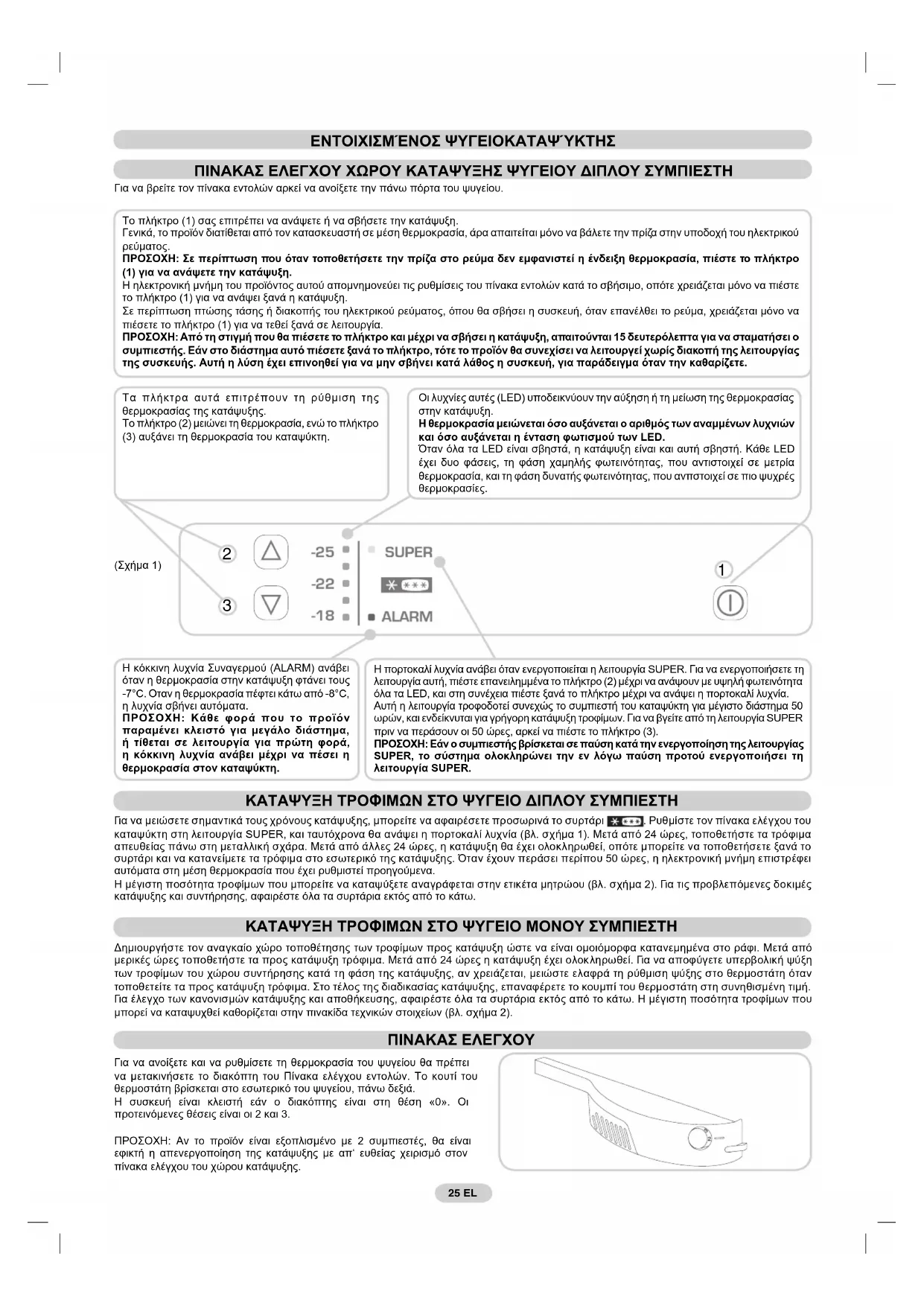ΚΑΤΑΨΥΞΗ ΤΡΟΦΙΜΩΝ ΣΤΟ ΨΥΓΕΙΟ ΔΙΠΛΟΥ ΣΥΜΠΙΕΣΤΗ Για να μειώσετε σημαντικά τους χρόνους κατάψυξης, μπορείτε να αφαιρέσετε προσωρινά το συρτάρι . Ρυθμίστε τον πίνακα ελέγχου του καταψύκτη στη λειτουργία SUPER, και ταυτόχρονα θα ανάψει η πορτοκαλί λυχνία (βλ. σχήμα 1). Μετά από 24 ώρες, τοποθετήστε τα τρόφιμα απευθείας πάνω στη μεταλλική σχάρα. Μετά από άλλες 24 ώρες, η κατάψυξη θα έχει ολοκληρωθεί, οπότε μπορείτε να τοποθετήσετε ξανά το συρτάρι και να κατανείμετε τα τρόφιμα στο εσωτερικό της κατάψυξης. Όταν έχουν περάσει περίπου 50 ώρες, η ηλεκτρονική μνήμη επιστρέφει αυτόματα στη μέση θερμοκρασία που έχει ρυθμιστεί προηγούμενα. Η μέγιστη ποσότητα τροφίμων που μπορείτε να καταψύξετε αναγράφεται στην ετικέτα μητρώου (βλ. σχήμα 2). Για τις προβλεπόμενες δοκιμές κατάψυξης και συντήρησης, αφαιρέστε όλα τα συρτάρια εκτός από το κάτω. ΠΙΝΑΚΑΣ ΕΛΕΓΧΟΥ Για να ανοίξετε και να ρυθμίσετε τη θερμοκρασία του ψυγείου θα πρέπει να μετακινήσετε το διακόπτη του Πίνακα ελέγχου εντολών. Το κουτί του θερμοστάτη βρίσκεται στο εσωτερικό του ψυγείου, πάνω δεξιά. Η συσκευή είναι κλειστή εάν ο διακόπτης είναι στη θέση «0». Οι προτεινόμενες θέσεις είναι οι 2 και 3. ΠΡΟΣΟΧΗ: Αν το προϊόν είναι εξοπλισμένο με 2 συμπιεστές, θα είναι εφικτή η απενεργοποίηση της κατάψυξης με απ‘ ευθείας χειρισμό στον πίνακα ελέγχου του χώρου κατάψυξης. Τα πλήκτρα αυτά επιτρέπουν τη ρύθμιση της θερμοκρασίας της κατάψυξης. Το πλήκτρο (2) μειώνει τη θερμοκρασία, ενώ το πλήκτρο (3) αυξάνει τη θερμοκρασία του καταψύκτη. Η κόκκινη λυχνία Συναγερμού (ΑLΑRΜ) ανάβει όταν η θερμοκρασία στην κατάψυξη φτάνει τους -7°C. Οταν η θερμοκρασία πέφτει κάτω από -8°C, η λυχνία σβήνει αυτόματα. ΠΡΟΣΟΧΗ: Κάθε φορά που το προϊόν παραμένει κλειστό για μεγάλο διάστημα, ή τίθεται σε λειτουργία για πρώτη φορά, η κόκκινη λυχνία ανάβει μέχρι να πέσει η θερμοκρασία στον καταψύκτη. Η πορτοκαλί λυχνία ανάβει όταν ενεργοποιείται η λειτουργία SUPER. Για να ενεργοποιήσετε τη λειτουργία αυτή, πιέστε επανειλημμένα το πλήκτρο (2) μέχρι να ανάψουν με υψηλή φωτεινότητα όλα τα LED, και στη συνέχεια πιέστε ξανά το πλήκτρο μέχρι να ανάψει η πορτοκαλί λυχνία. Αυτή η λειτουργία τροφοδοτεί συνεχώς το συμπιεστή του καταψύκτη για μέγιστο διάστημα 50 ωρών, και ενδείκνυται για γρήγορη κατάψυξη τροφίμων. Για να βγείτε από τη λειτουργία SUPER πριν να περάσουν οι 50 ώρες, αρκεί να πιέστε το πλήκτρο (3). ΠΡΟΣΟΧΗ: Εάν ο συμπιεστής βρίσκεται σε παύση κατά την ενεργοποίηση της λειτουργίας SUPER, το σύστημα ολοκληρώνει την εν λόγω παύση προτού ενεργοποιήσει τη λειτουργία SUPER. 25 EL Οι λυχνίες αυτές (LΕD) υποδεικνύουν την αύξηση ή τη μείωση της θερμοκρασίας στην κατάψυξη. Η θερμοκρασία μειώνεται όσο αυξάνεται ο αριθμός των αναμμένων λυχνιών και όσο αυξάνεται η ένταση φωτισμού των LED. Όταν όλα τα LED είναι σβηστά, η κατάψυξη είναι και αυτή σβηστή. Κάθε LED έχει δυο φάσεις, τη φάση χαμηλής φωτεινότητας, που αντιστοιχεί σε μετρία θερμοκρασία, και τη φάση δυνατής φωτεινότητας, που ανπστοιχεί σε πιο ψυχρές θερμοκρασίες. Το πλήκτρο (1) σας επιτρέπει να ανάψετε ή να σβήσετε την κατάψυξη. Γενικά, το προϊόν διατίθεται από τον κατασκευαστή σε μέση θερμοκρασία, άρα απαιτείται μόνο να βάλετε την πρίζα στην υποδοχή του ηλεκτρικού