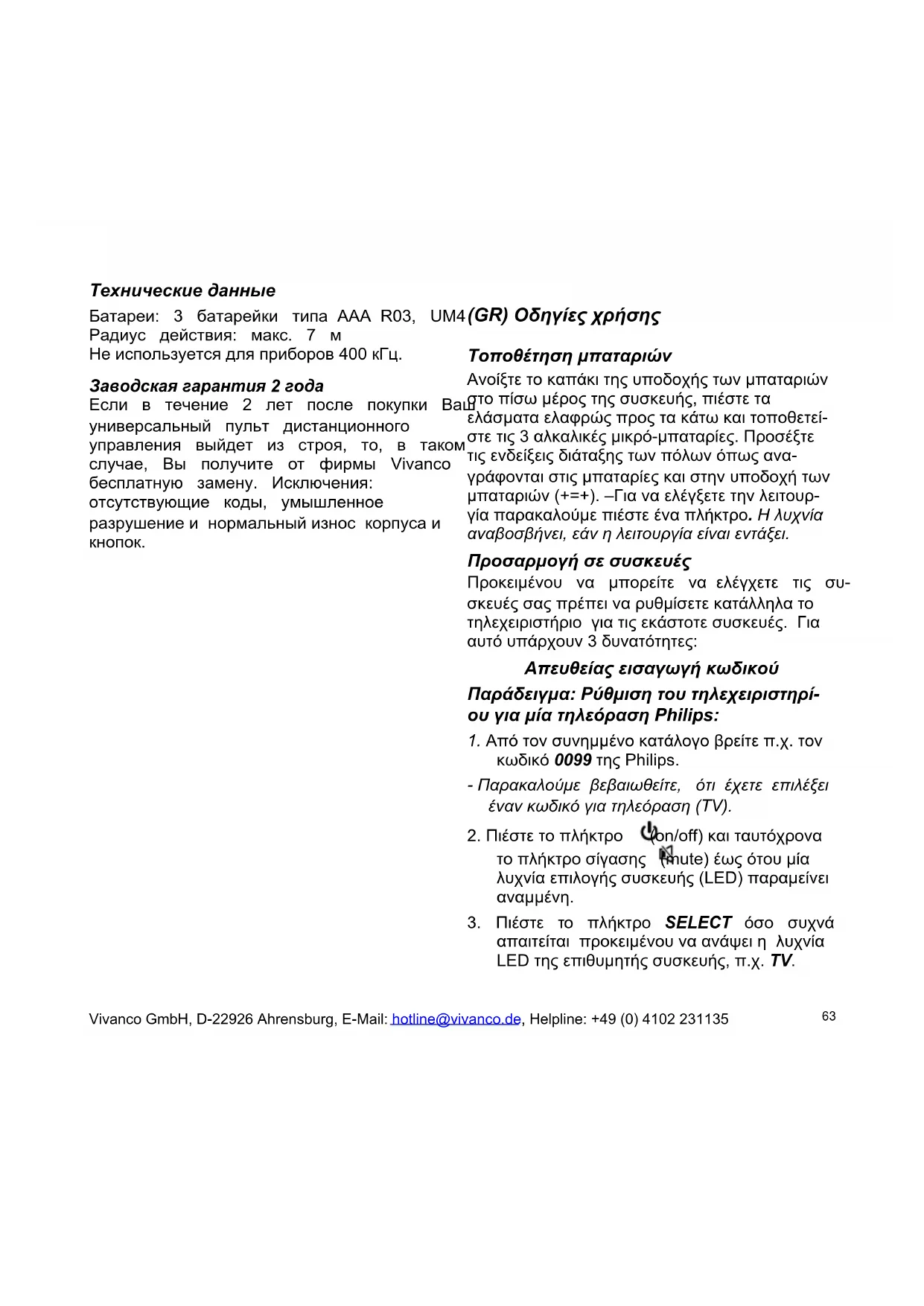 (GR) Οδηγίες χρήσης Τοποθέτηση μπαταριών Ανοίξτε το καπάκι της υποδοχής των μπαταριών στο πίσω μέρος της συσκευής, πιέστε τα ελάσματα ελαφρώς προς τα κάτω και τοποθετεί- στε τις 3 αλκαλικές μικρό-μπαταρίες. Προσέξτε τις ενδείξεις διάταξης των πόλων όπως ανα- γράφονται στις μπαταρίες και στην υποδοχή των μπαταριών (+=+). –Για να ελέγξετε την λειτουρ- γία παρακαλούμε πιέστε ένα πλήκτρο. Η λυχνία αναβοσβήνει, εάν η λειτουργία είναι εντάξει. Προσαρμογή σε συσκευές Προκειμένου να μπορείτε να ελέγχετε τις συ- σκευές σας πρέπει να ρυθμίσετε κατάλληλα το τηλεχειριστήριο για τις εκάστοτε συσκευές. Για αυτό υπάρχουν 3 δυνατότητες: Απευθείας εισαγωγή κωδικού Παράδειγμα: Ρύθμιση του τηλεχειριστηρί- ου για μία τηλεόραση Philips: