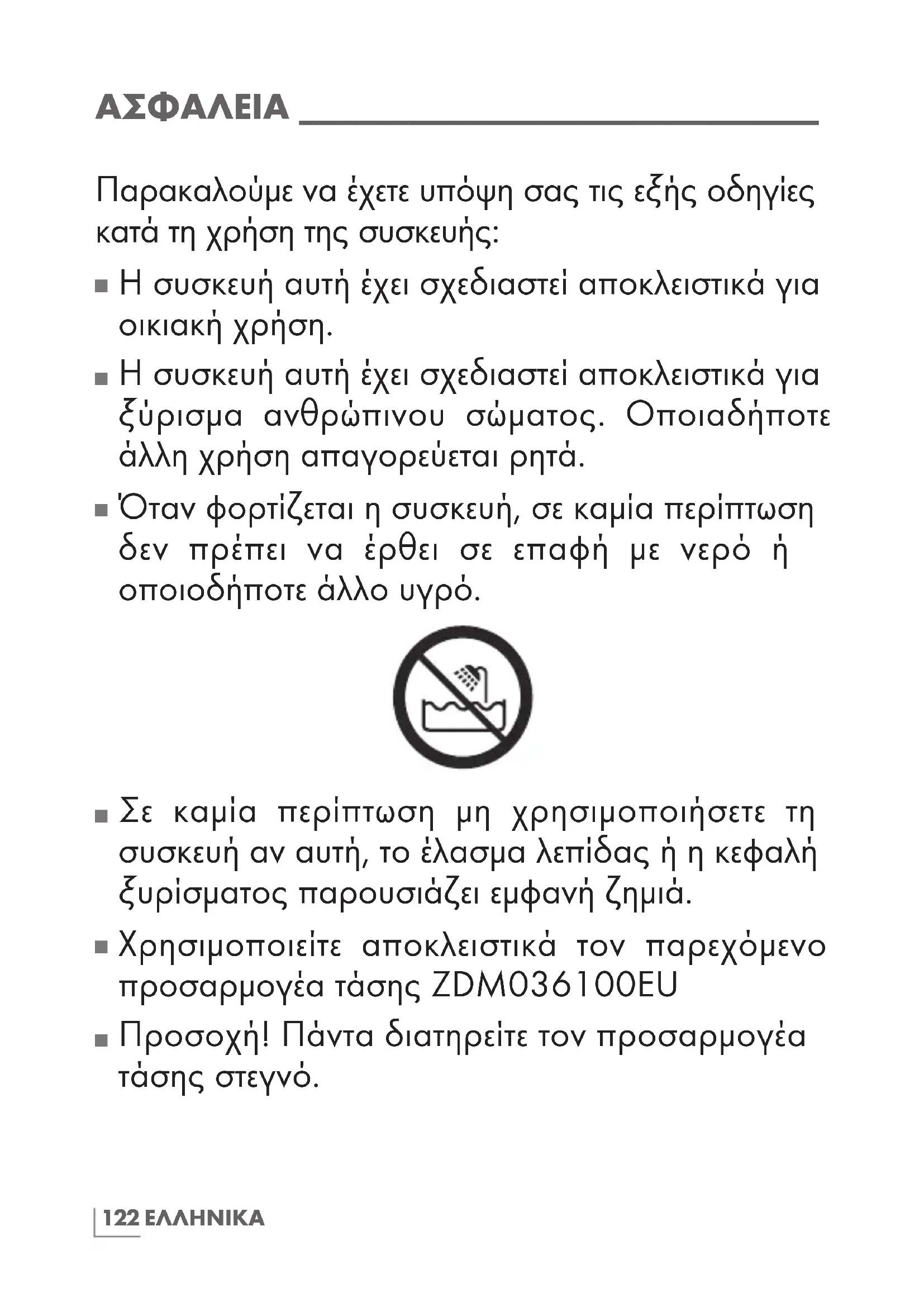 Η συσκευή αυτή έχει σχεδιαστεί αποκλειστικά για ξύρισμα ανθρώπινου σώματος. Οποιαδήποτε άλλη χρήση απαγορεύεται ρητά.